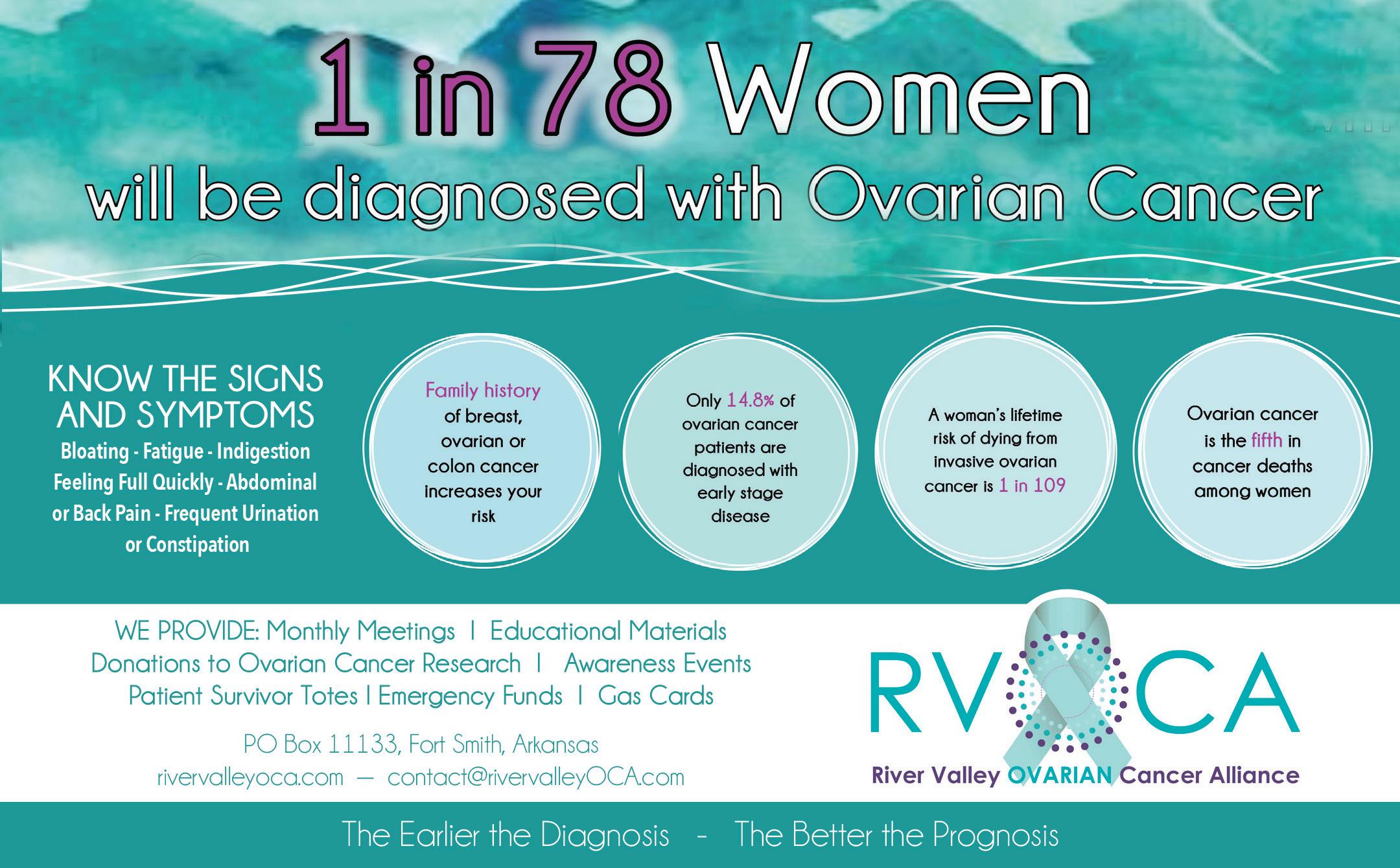 Ovarian cancer doesn't discriminate based on age or race; it can happen to any female. There is NO PREVENTATIVE SCREENING TEST! A Pap Test does not detect ovarian cancer. Over 22,500 new cases of ovarian cancer will be diagnosed in the US this year. Knowing the signs and symptoms of ovarian cancer can help our mothers, daughters, wives, and sisters fight this disease early, when treatment is more effective. Early detection and proper treatment are the best defenses against ovarian cancer. We must pay attention to our bodies, know the symptoms and be our own advocates. Listen carefully, it whispers. Meetings the first Tuesday of each month at the Fort Smith Public Library in Fort Smith, 6:30pm.