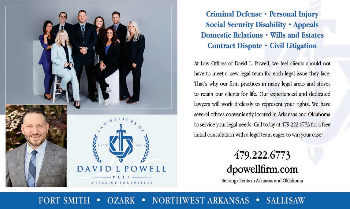 “Our practice was founded on the belief clients should not have to meet a new legal team for each legal issue they face,” says David Powell. “That’s why our firm practices in many legal areas and strives to retain our clients for life.” The practice operates offices in Fort Smith, Farmington and Ozark, Arkansas, as well as Sallisaw, Oklahoma. Each attorney in the practice was handpicked to carry forth the practice’s legacy of service and outstanding legal expertise.