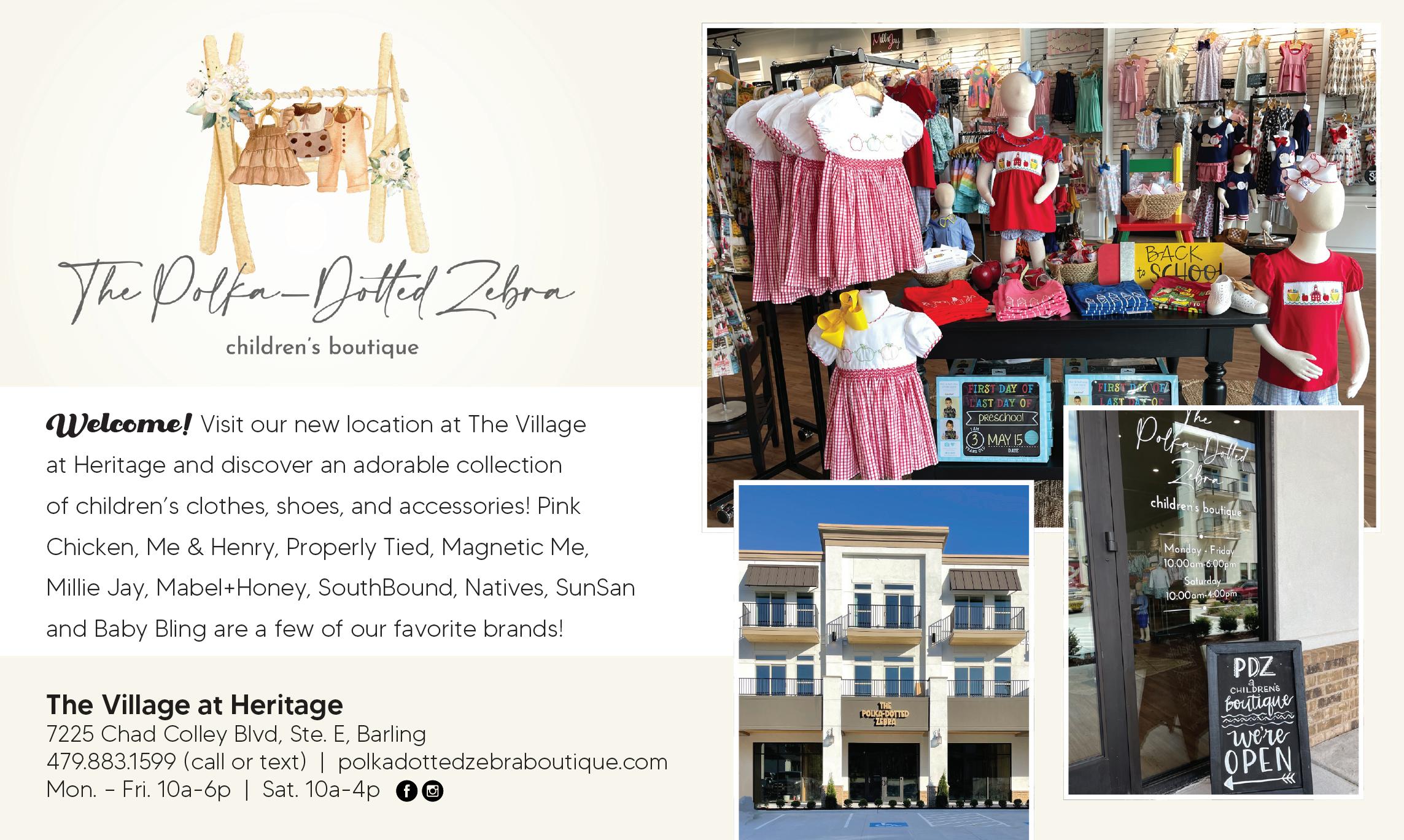 Ever since Sheila Bailey opened her charming boutique The PolkaDotted Zebra, parents and grandparents alike have flocked to her store to shop an adorable collection of children’s clothes, shoes and accessories. And now with its new location, a 2,620-squarefoot showplace in Fort Smith’s bustling Chaffee Crossing district, the store enters a new chapter serving families throughout the River Valley.