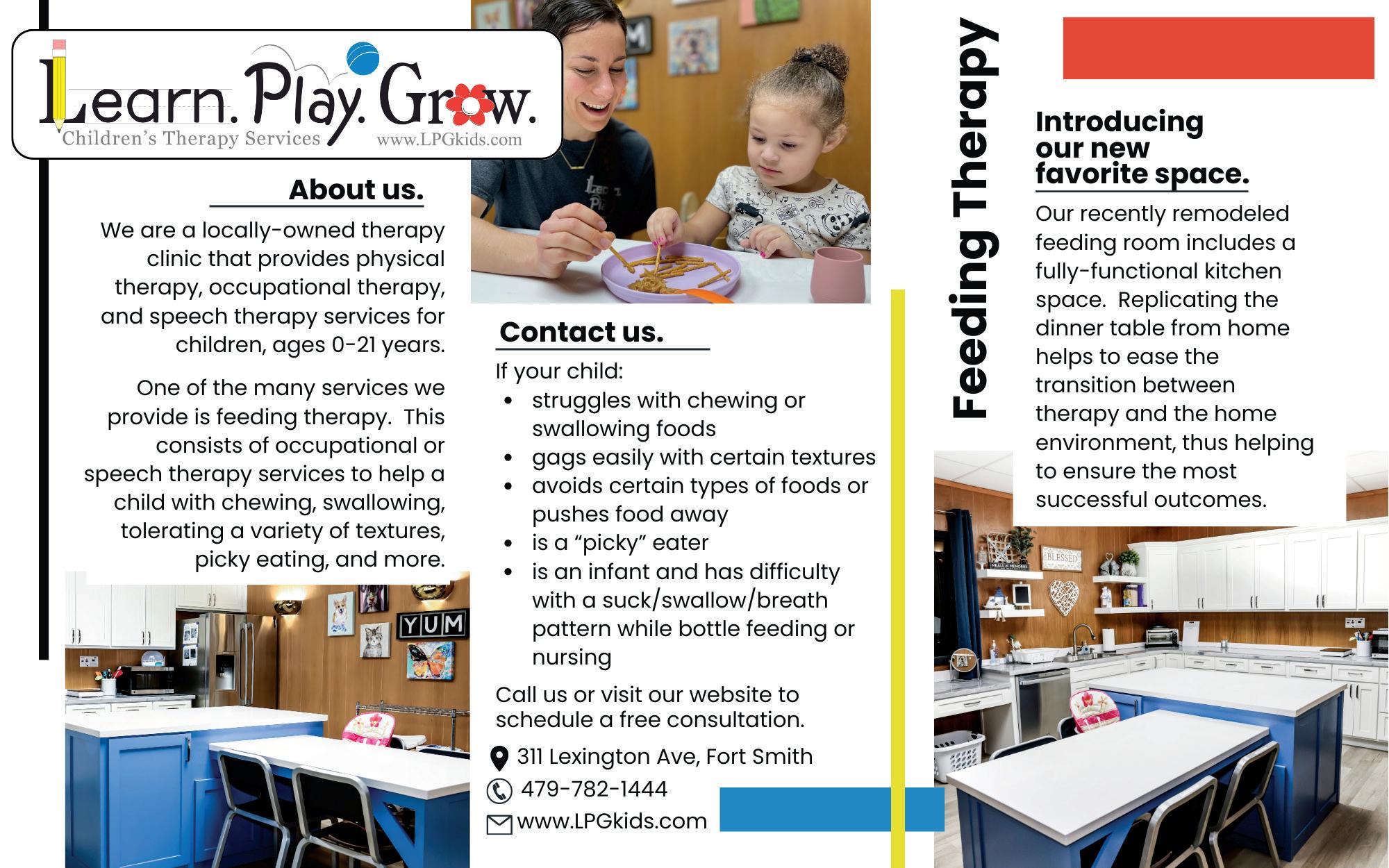 Learn, Play, Grow Children’s Therapy Services is a pediatric outpatient clinic, conveniently located in the heart of Fort Smith, at 311 Lexington Avenue. LPG serves the River Valley and Eastern Oklahoma by providing Occupational, Physical, and Speech therapy to clients, ages birth to 21 years. We host monthly support groups for families of individuals with Down Syndrome and Spina Bifida. LPG accepts most private insurances, AR Medicaid, and SoonerCare. We are very proud of our amazing team of therapists at LPG and are seeking to expand our team! We are currently hiring for Speech Language Pathologists and have a variety of positions available; Full-Time, Part-Time, and PRN. Call us for more information!