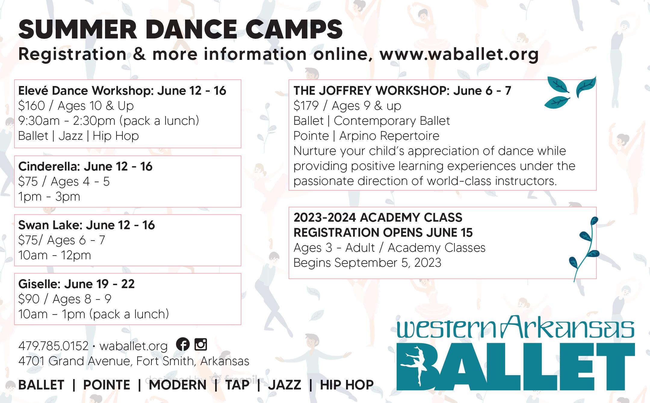 Western Arkansas Ballet Academy offers classes in ballet, pointe, modern, jazz, tap, and hip hop for ages 3 through adult. Committed to creating a community dedicated to the Fine Arts through quality dance education, training, and performance, Western Arkansas Ballet Academy is proud to provide three performance opportunities each season to local dancers. The 2023-2024 season includes the 38th Annual production of The Nutcracker December 16 & 17, 2023 at the ArcBest Performing Arts Center in downtown Fort Smith. Summer dance camp and workshop registration is open now and our 2023-2024 Academy registration opens June 15, 2023. You can learn more and register online at waballet.org.