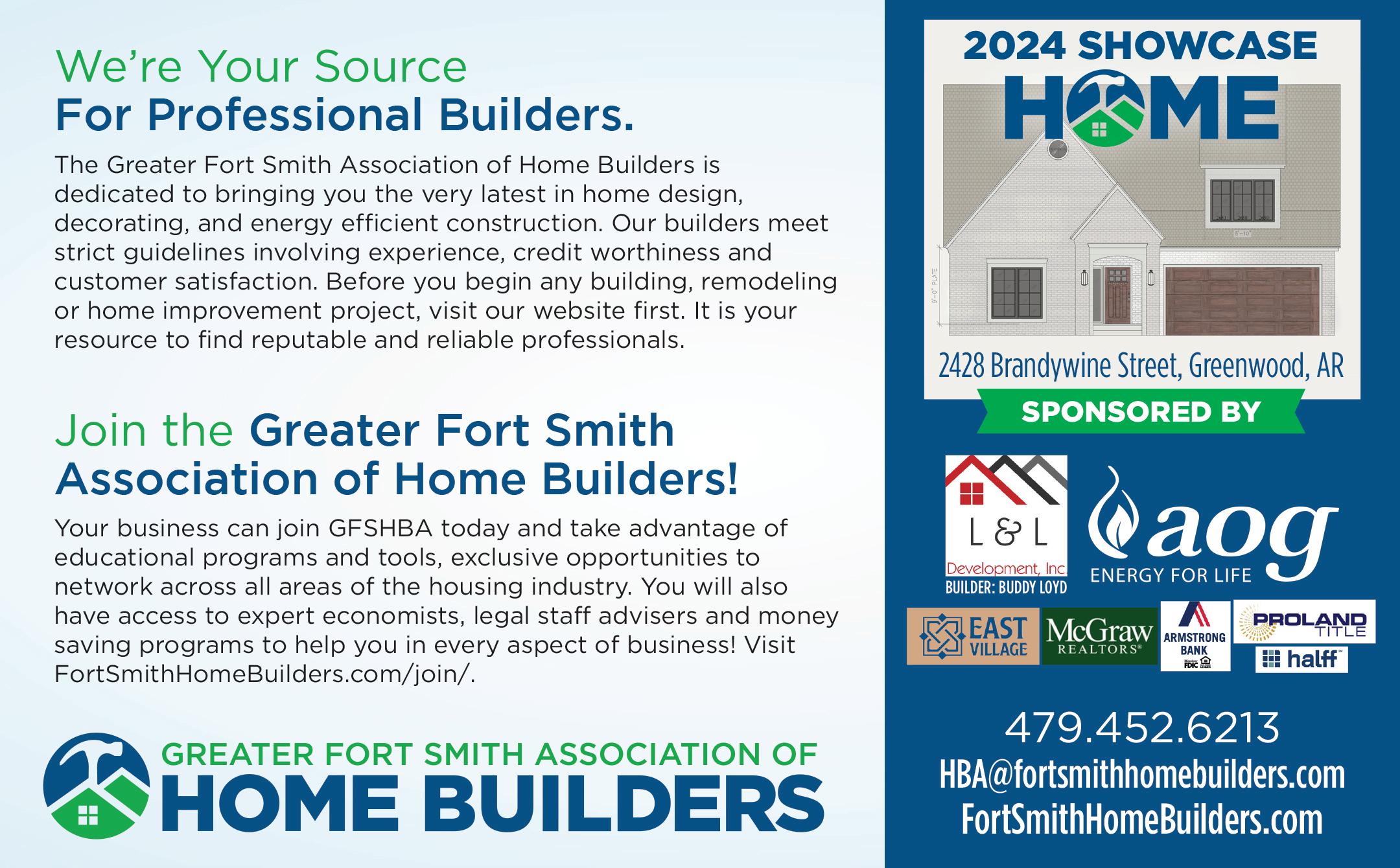 The Greater Fort Smith Association of Home Builders, established in 1955, is a professional organization that promotes quality housing for our community. We strive to increase public awareness of our member's products and services and advocate industry standards. Today, the Association is proud to have over 200 local firms on its membership roll. Our councils and committees oversee projects such as the annual Home Show, Parade of Homes, Showcase Home, and Scholarship Golf Tournament. The GFSHBA is not only for builders—many types of businesses also enjoy membership benefits. Call today to see how your business could utilize what the GFSHBA offers!