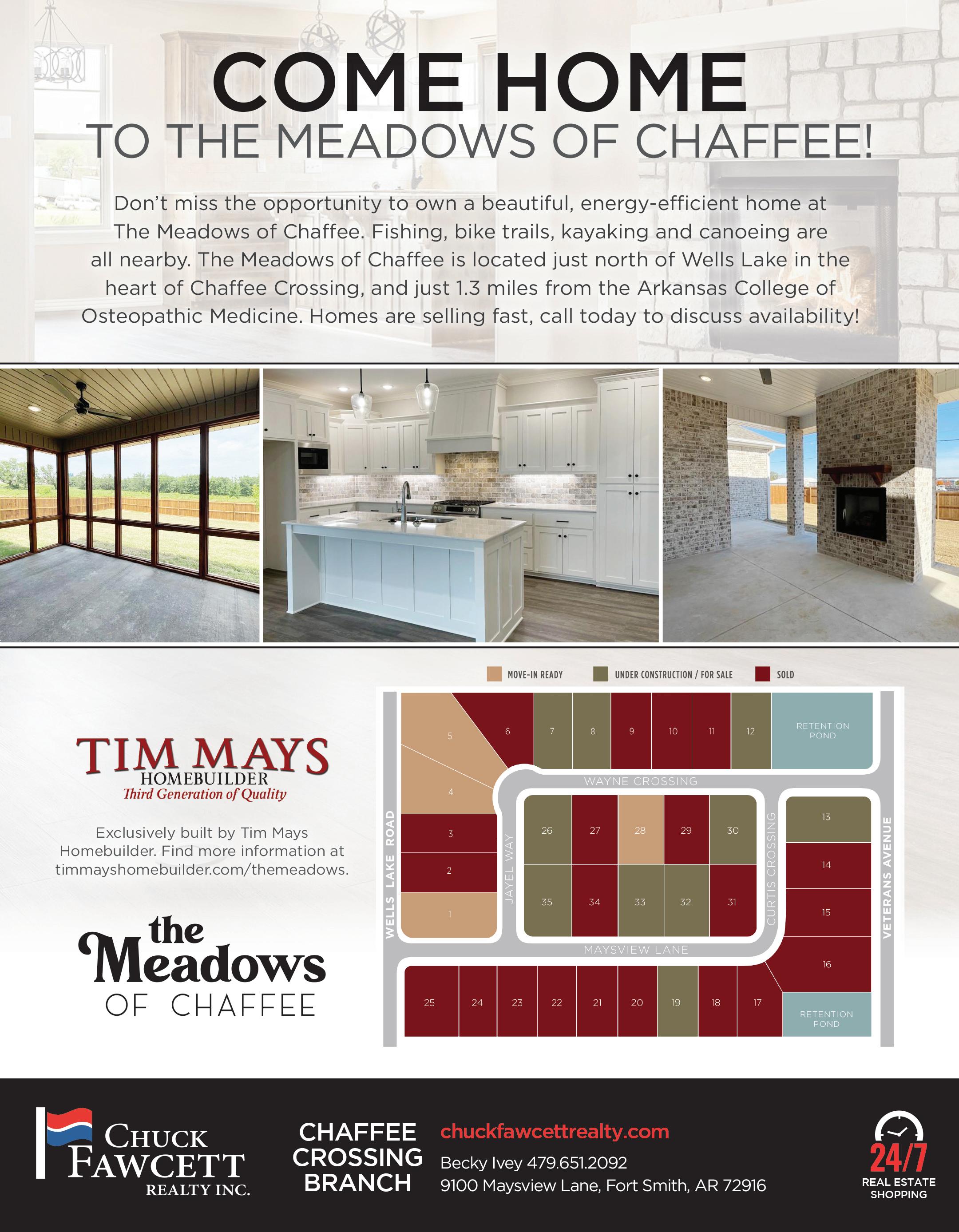 Chuck Fawcett Realty, Inc. is a trusted name in home, commercial, and land sales in western Arkansas and eastern Oklahoma. Where you live has such a significant influence on your happiness. Let us show you The Meadows of Chaffee, where you can enjoy the outdoors and take advantage of all Chaffee Crossing offers. A high-efficiency, beautiful home with high-quality detail is ready for you to enjoy! Call today for more information.
