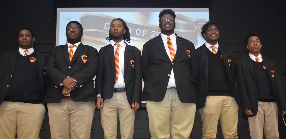 Students reviewing questions during the event; Messrs. Amarion Williams-Vaughn, Class of 2024, Braylon Stokes. Class of 2025, Christian Jackson, Class of 2025, James Avery, Class of 2024, Orlan’dre Smoot, Class of 2024, Cameron Townsend, Class of 2025; Mr. Perron Thurston after being announced the winner of the day of trivia in December.