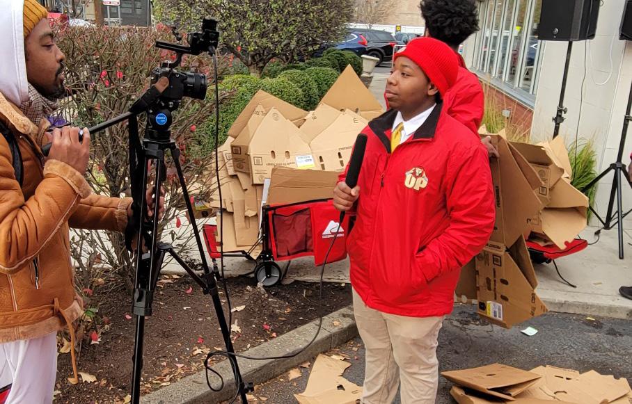 Photos Credit: LaToya Wilson Pride Leader Mr. Fazson Chapman, Urban Prep Alum from the Class of 2013 Englewood Campus with Bronzeville students, Messrs. James Hill, Class of 2025, David Simmons, Class of 2025, Qwaylin Miller, Class of 2023, Raymond Gardner, Class of 2025, Kamari Payne, Class of 2023 and Dwain Melton, Class of 2024 at the volunteer event passing out turkeys and being interviewed.