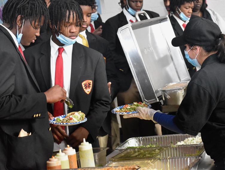 Students enjoy the catered taco bar; Ms. Bernice Hampton and Mr. Tayshawn Williams, Class of 2023; Urban Prep Englewood Alum Mr. Fazson Chapman, Class of 2013 during the Alumni Game; Bronzeville Principal Joffrey Bywater, Mr. Jalen Jones, UP Downtown Class of 2015 Alum Jaquan Johnson and J. Simmons, Class of from the Englewood; Mr. Jack Avery and Mr. Henry Ogles, Class of 2024, Englewood Campus during the Alumni Game; Messrs. Isaiah Hymon, Class of 2024, Downtown Campus, Bricen Ward, Class of 2024, Bronzeville Campus, and Zachary Smith, Class of 2024, Downtown Campus pose for a picture during lunch; UP Alumni help distribute holiday gifts to students; Urban Prep Englewood Alum Steven McAfee, Class of 2013 shooting a freethrow during the Alumni Game and Mr. KShawn Moore, Englewood Class of 2025 pose with his attire for the Kwanza Assembly.