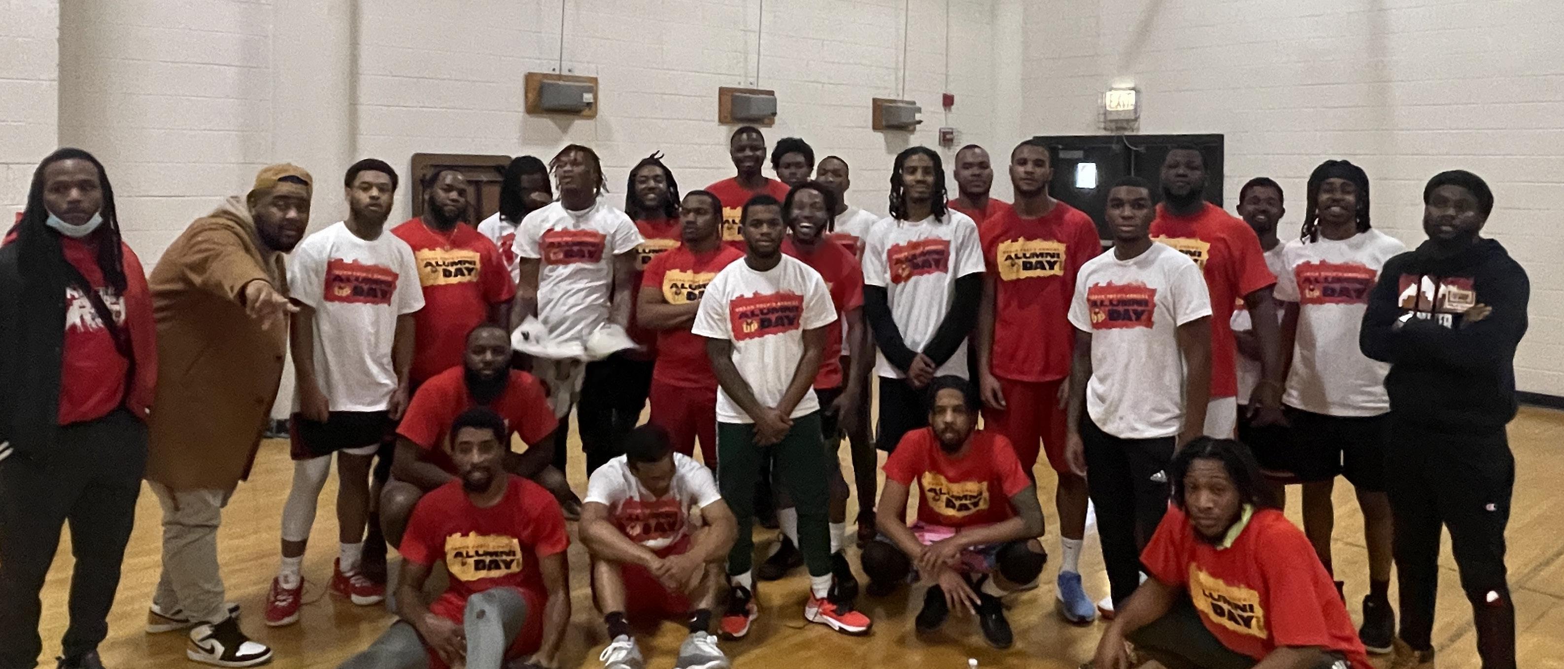 Urban Prep Alumni pose for a photo after the alumni basketball game; UP Englewood Campus Alumni Messrs. Brian Peters, Class of 2021 and JaBrice Reese Class of 2011, Englewood during the basketball game, Englewood Alumni Messrs.Michael Taylor, Class of 2016 and Brandon Sparkman, Class 2015 talking during lunch; Mr. Joseph Olalusi, Class of 2015, Englewood Campus speaking during the alumni panel.