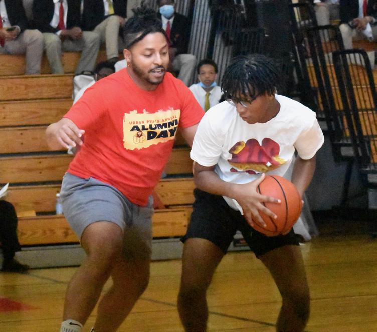 Mr. Montrell Otey speaks during the Alumni Panel; Urban Prep Parent Ms. Frances Bruce, Mrs. Rose Jefferies, Ms. Sonya Teague, Ms. Jessica Chandler, Ms. Bridgette Simmons and are all honored during the Annual Kwanzaa Assembly coordinated by Mr. Johnny Dorsey, who is a Pride Leader at the Englewood Campus; Chief Operating Officer Troy Boyd, Jr. tries to steal the ball from Mr. Yashua Beals, Class of 2025 from the Downtown Campus during the Alumni Game; Athletic Coordinator and PE Instructor Mr. James Jefferies on the defense against Mr. Kamren Beckley, Bronzeville Class of 2023 during the Alumni Game; and UP Englewood Class of 2018 Alum Mr. Jeremiah Moss, shooting free throws during the game.