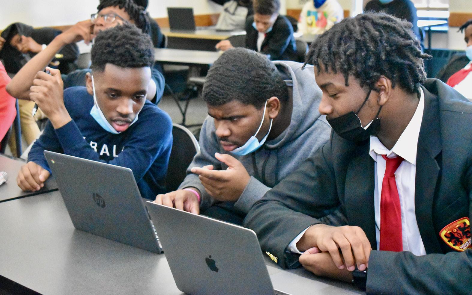Dr. Davis speaking with Urban Prep Englewood Students, Messrs. Billy Hayes, Class of 2023, Calvin Jordan, Class of 2023, and Colin Berry, Class of 2026