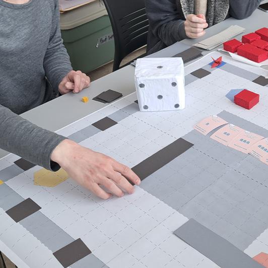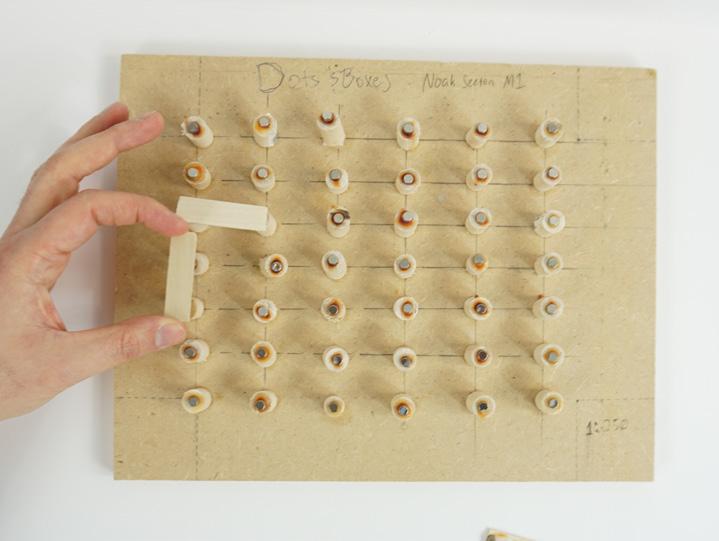 A magnetic board game inspired by Dots and Boxes provides an illustrative example of material experimentation. Crafted from repurposed scrap wood and magnetic tokens, the game invites players to draw connections—not with pens, but by placing wooden pieces fitted with magnetic pegs to form boxes. This tactile, collaborative reinterpretation transforms strategic play into a material-driven exploration. The game exemplifies how familiar formats can be reimagined as tools for creative engagement, encouraging participants to interact with materials—and with one another—in innovative and meaningful ways. It emphasizes inclusivity, reuse, and co-creation.