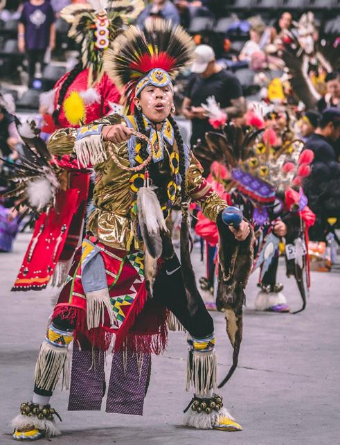 A feather is a symbol within native culture that signifies honor and connection between the owner, the Creator and the bird the feathers come from. The headresses worn during ceremonies and dances have feathers attached to them. These are typically from a fallen bird that is native to the local area of the tribe making the headress. A part of the dress worn for dances are bells which are often fastened to sheep skin and then tied to the ankle. Bells create a grand entrance for the dancer and help keep the rhythm with the beat of the music.