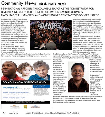 promise to provide economic opportunity for the entire community but specifically for the minority community and through community outreach. By partnering with the NAACP the goal of diversity will be met.” There is no organization better situated than, the NAACP the oldest and strongest civil rights organization in America, to ensure diversity.” The NAACP announces their “Get Listed! Campaign as Phase 1 of the construction process begins. Penn and the NAACP are requesting all minority contractors, vendors and supplier to “Get Listed” by logging on to www.columbusnaacp.org under tab “Action Alerts” or www.hollywoodcasinocolumbus. com and get registered before September 15th. We encourage all to register! Eric Schippers, Senior Vice President, Public Affairs, of Penn National commented, “we are proud to partner with the Columbus NAACP and members of the minority business community of Columbus and Franklin County in our efforts to provide the economic opportunity we promised in our campaign. It is important for interested businesses to register with us. We advise all contractors who are not certified MBEs and WBEs to start the process now.” With a planned investment of approximately $400 million, Hollywood Casino Columbus, which is expected to open in the second half of 2012, will include 180,000 square feet of gaming space, 3,000 slot machines, 85 table games, 25 poker tables, a parking garage, a variety of food and beverage offerings and an entertainment lounge. The NAACPGET LISTED! Campaign will provide additional marketing, advertising and community outreach events. For more information on upcoming events and announcements visit our website at www.columbusnaacp.org or www. hollywoodcasinocolumbus.com.