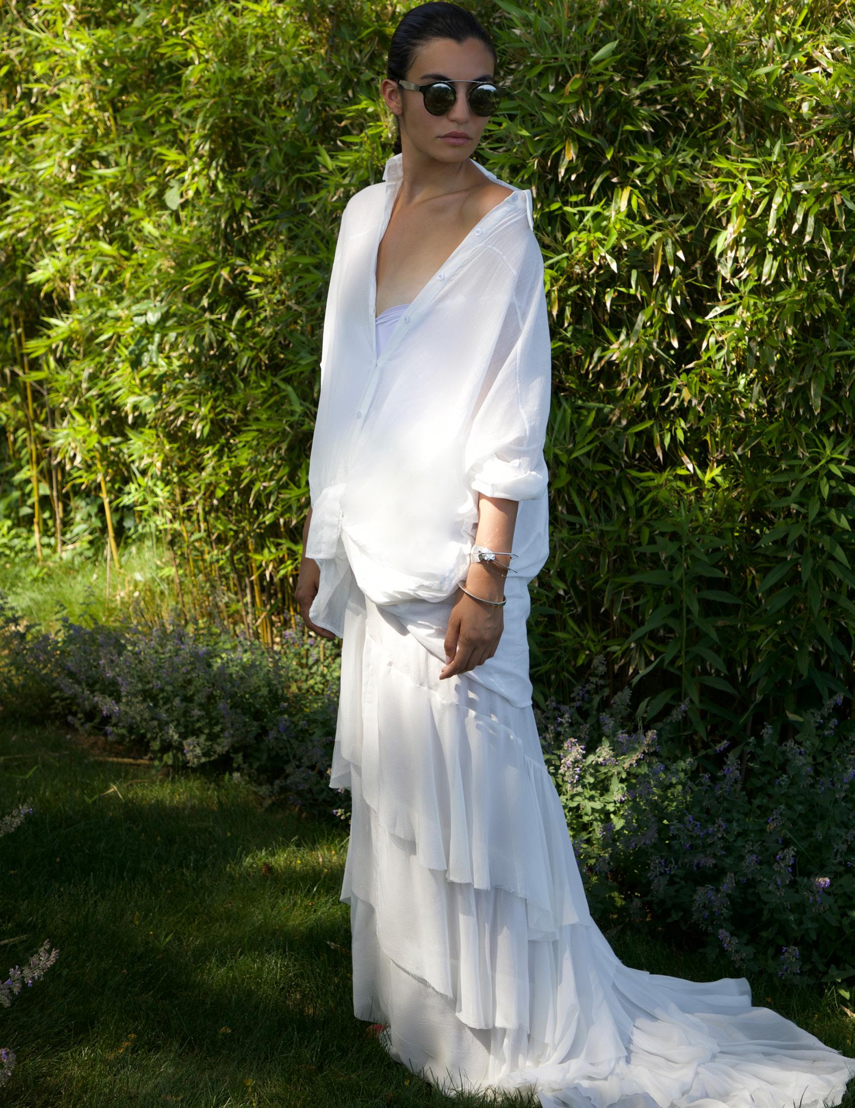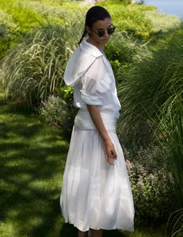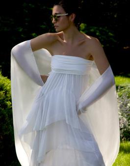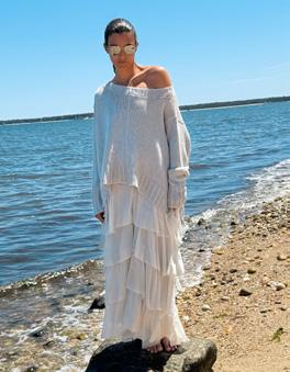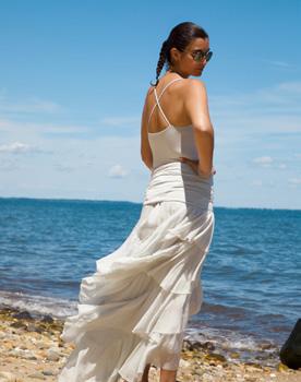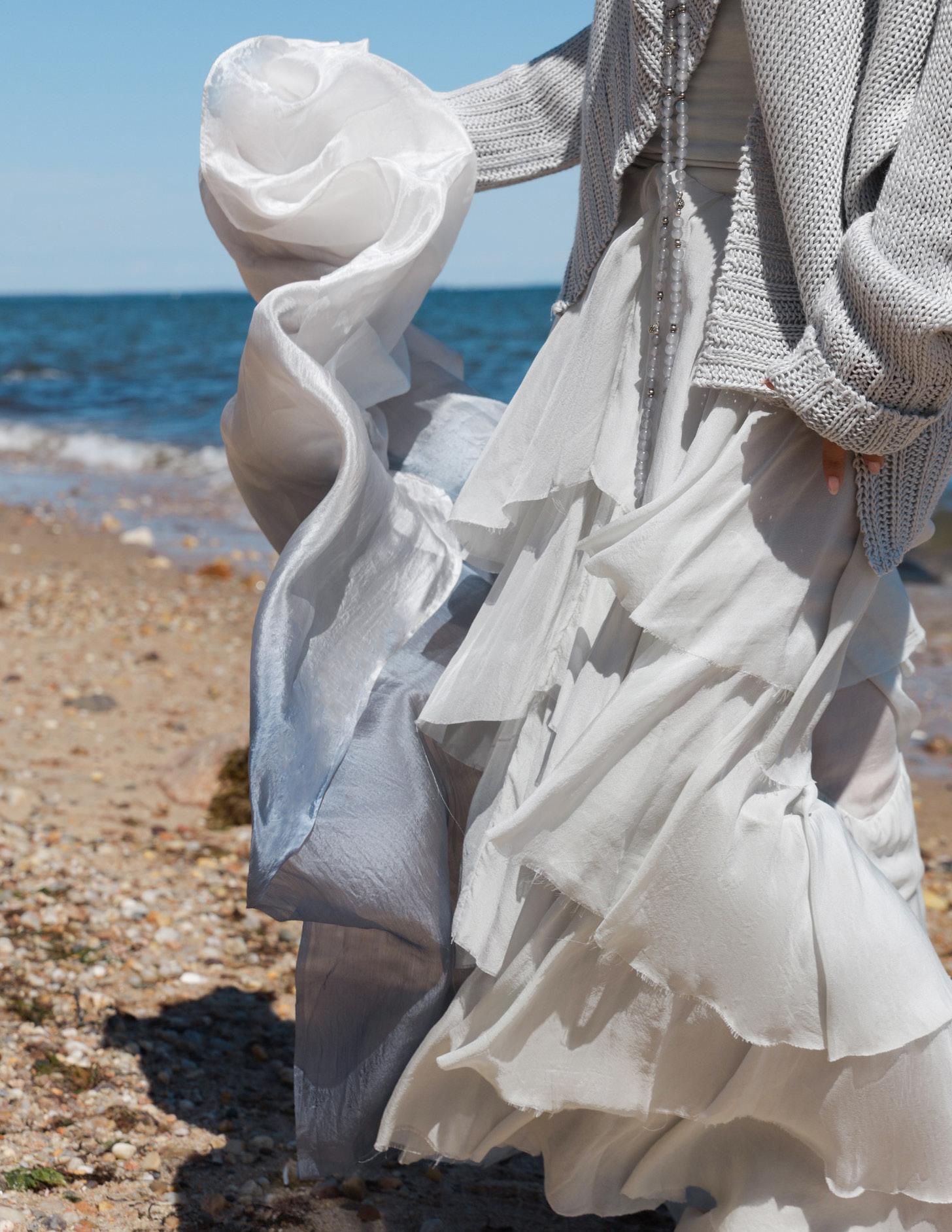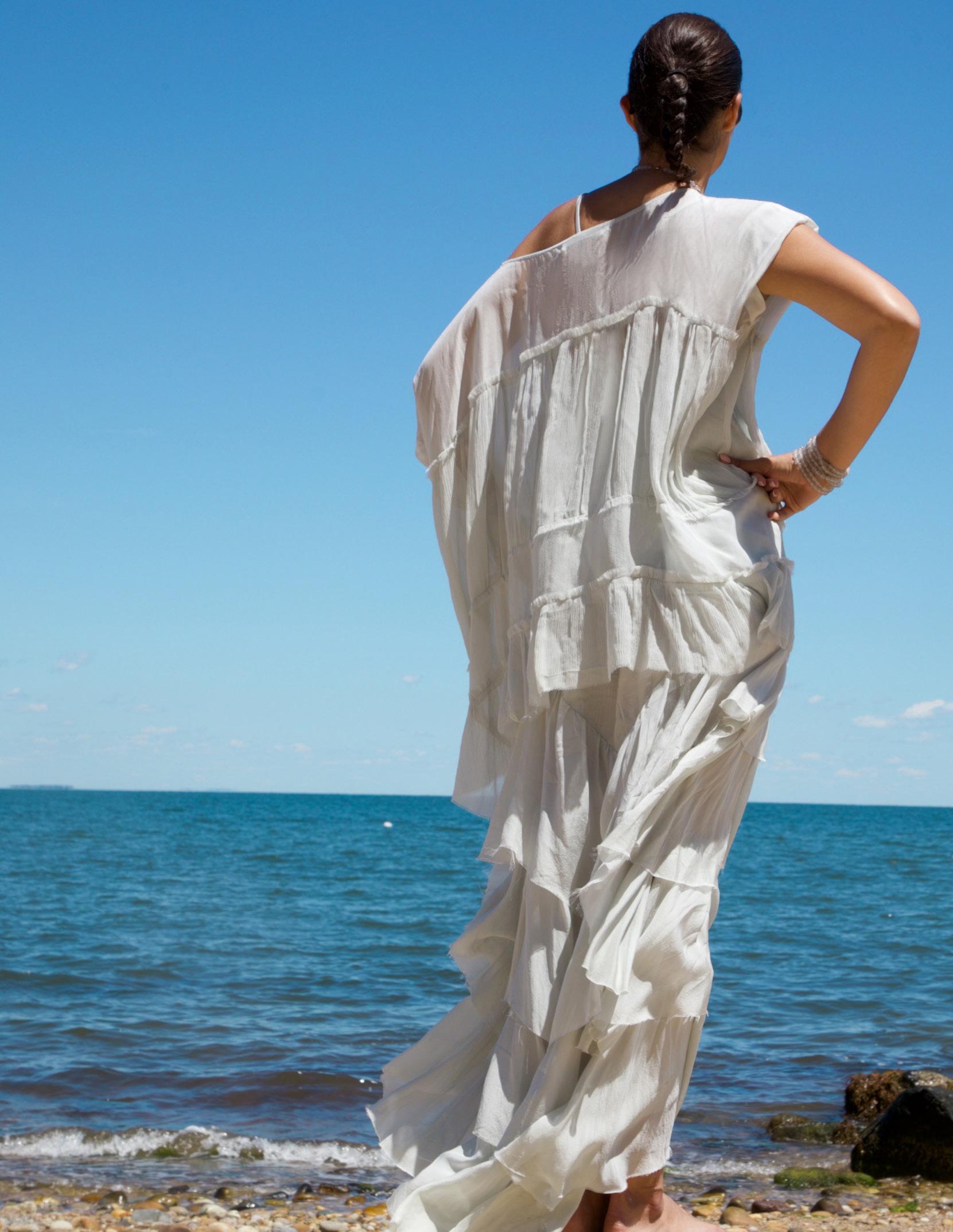 Assorted African Glass, Sponge Coral, Carnelian Beads. $1,400 Silk Ruffle Layer Top Silver. $695 Silk Cascade Ruffle Skirt Silver. $995