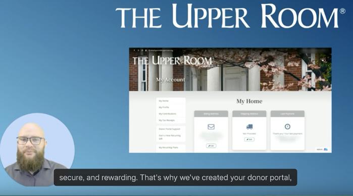 Empower your giving. Create an account in our secure donor portal to access your giving history, update your information, download tax receipts, or make a new gift. Scan to log on or visit UpperRoom.org/ donorportal. Need a virtual coach to help you open an account? Upper Room Fund Development’s own Ben Crumbley will teach you how, step-by-step, through short tutorials. Visit UpperRoom.org/ donorportalsupportvideos