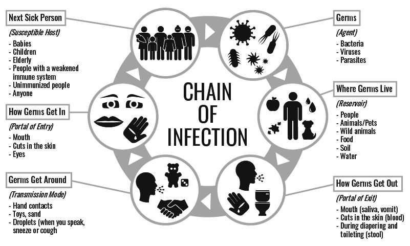 Germs such as bacteria and viruses are everywhere in our environment including door knobs, elevator buttons and on sinks. When bacteria and viruses have the ability to cause diseases such as the common cold, influenza, COVID and other infections, these contaminated surfaces can pass illness from one person to another. This is referred to as the Chain of Infection.