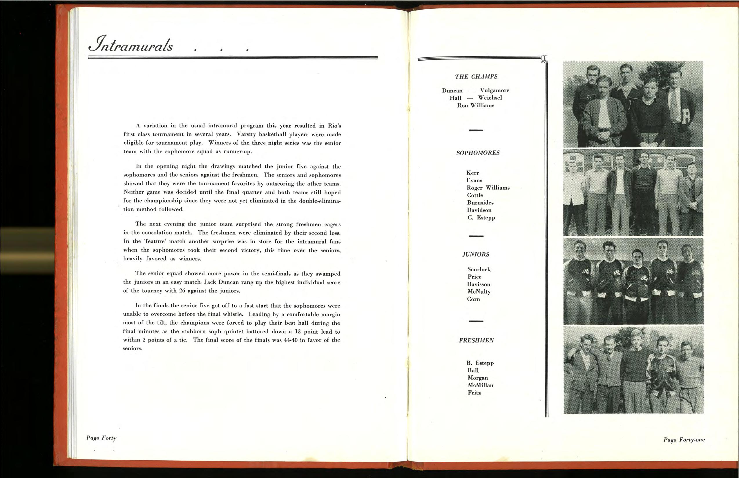 Still undiscouraged, the Rio eleven scheduled a tilt with Ohio U's B team. Played on the Gallia Academy field, the Red and White made up for their bad beginning in the Tech game by threatening to score in the first quarter. During the second quarter the Reds were surprised by the 'subs' who were sent in. Nearly all of them were the Green and White varsity subs and several moved into Ohio U's starting eleven before the end of their successful season. Dick Morgan ran back a kick-off 80 years to cross the goal but the score was not counted because the official ruled he stepped out of bounds. Score 59-0.