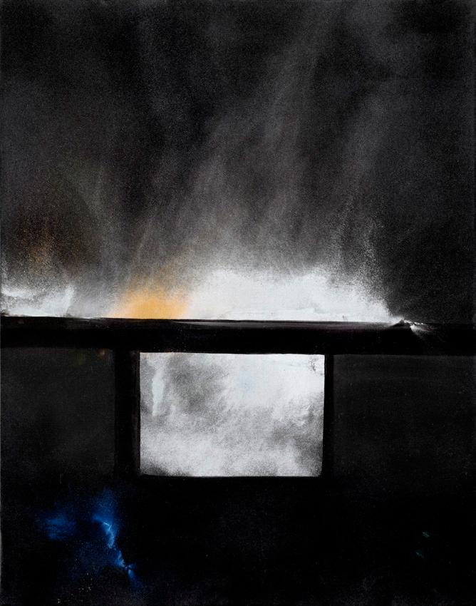 The paintings in this series exude a meditative, abstract quality, inviting individual interpretation. Sanchez’s monochromatic palette, dominated by dramatic black, is punctuated with translucent geometric shapes—rectangles, squares, and strips—that glow with an ethereal light and are surrounded by halos. These geometric forms evoke windows or apertures, lingering over inner or perhaps external landscapes.