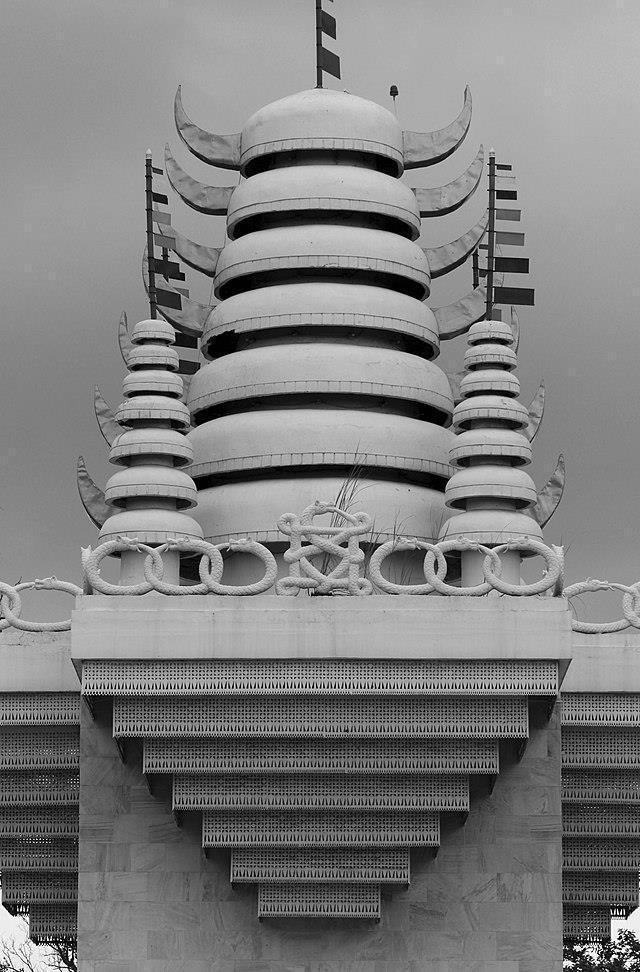 The themples and other buildings built in Meitei architecture is easily distinguished by slope roof with saw teeth like lining on the edge of the roof and the Holy Chirong (horns), attached on the top of the roof.