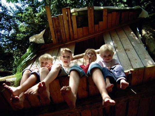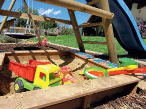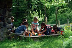 Die Natur ist der wichtigste Spielraum. Ergänzt wird sie durch kindgerechte Bereiche wie Sandkisten, Rutschen, Schaukeln oder Klettergeräte.