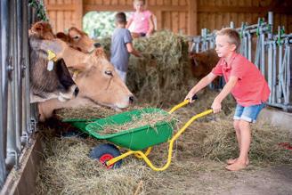 Mithilfe im Stall: Beim täglichen Füttern und Versorgen der Tiere – vom Eierholen bis zum Kälbchen streicheln – sind die Kinder aktiv dabei und lernen ganz nebenbei Verantwortung.