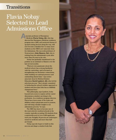 ssociate professor of Emergency Medicine Flavia Nobay, MD, who has directed the Emergency Medicine residency program since 2008, and mentored dozens of up-and-coming doctors along the way, will now become a familiar face to many more students as the SMD’s new associate dean for Admissions. She succeeds professor of Neuroscience John Hansen, PhD, who is retiring from his administrative post after more than 20 years in the role. Nobay has gradually transitioned to the position as an assistant to Hansen over the last several months. “Flavia is very passionate about the medical school, has a strong familiarity with the curriculum, and is focused on strengthening our Rochester connections, while building our national presence and outstanding alumni base,” says senior associate dean for Medical Student Education David Lambert, MD, who led the selection process. “She’s deeply committed to furthering the school’s holistic approach to student selection that John has so skillfully championed here.” This philosophy, says Lambert, looks beyond test scores to explore all the varied dimensions a student can bring to the profession. As a residency program director, Flavia has a keen sense of the traits and abilities today’s physicians need to possess, and will bring valuable insight to our admissions process,” he says. The SMD has risen to become one of the most selective medical schools in the country, typically accepting 104 students from a nationwide pool of over 6,000 applicants each year. Roughly 20 percent are underrepresented in medicine and more than half are female. Nobay says she hopes to build on this success and shape a student body that