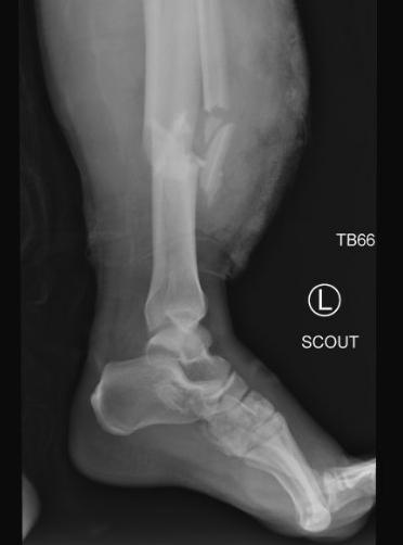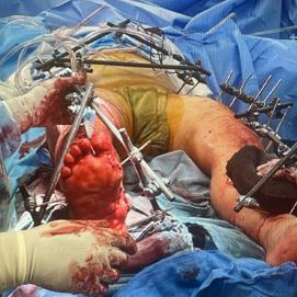 proceed to the operating room with Orthopedic Surgery to begin repairs of the bones in both legs and pelvis. Ultimately the injuries would require a ‘staged’ approach, meaning the legs and pelvis would need to be repaired over multiple operative procedures. The first operative procedure required two orthopedic surgery attendings due to the extent of the injuries, with one surgeon operating on the left leg and pelvis and one surgeon operating on the right leg. Between hospital day one and hospital day 17, the patient went to the operating room with orthopedics a total of seven times. The patient’s right leg underwent successful fixation. Unfortunately, the damage to the left leg was far more extensive and ultimately required amputation