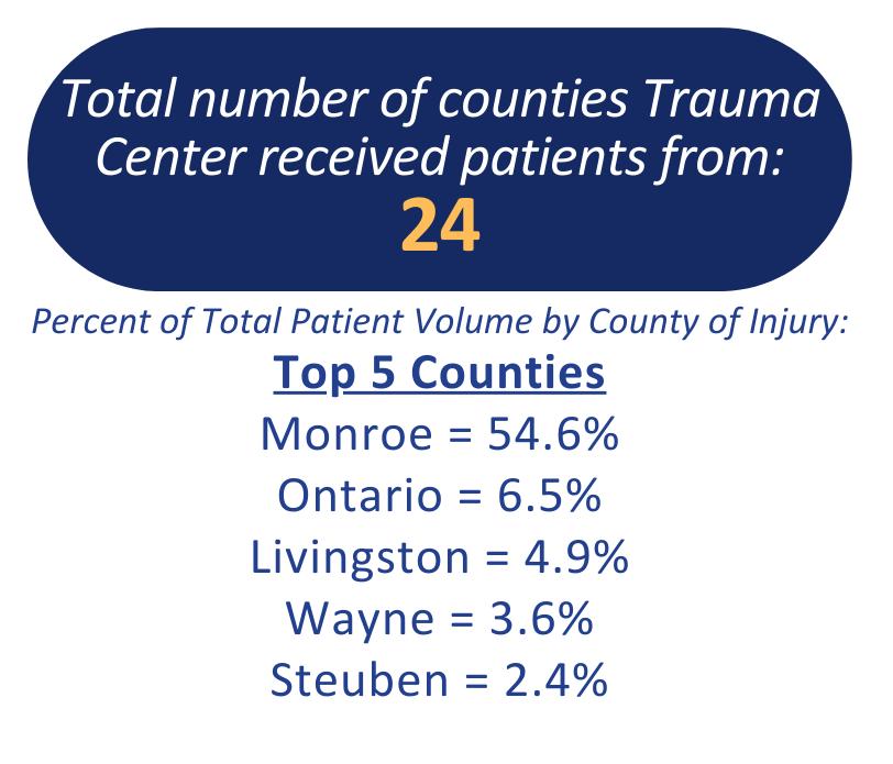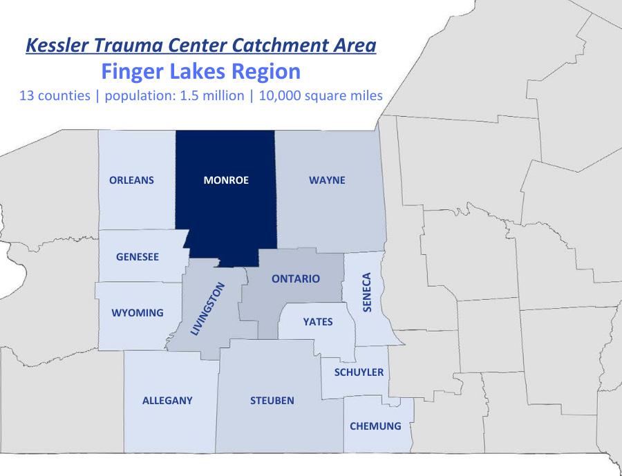 The Kessler Trauma Center at the University of Rochester-Strong Memorial Hospital is proud to provide state-of-the-art injury care to the citizens of the Finger Lakes Region of New York and beyond. As the only American College of Surgeons verified and New York State Department of Health designated level 1 trauma center in the region, the hospital serves a population of over 1.5 million residents spanning 13 counties. Strong Memorial Hospital is a 900-bed tertiary care facility that admits over 2,500 injured patients each year. The trauma center is staffed around the clock by fellowship-trained and board-certified trauma surgeons and surgical intensivists supported by orthopedic, neuro, vascular and plastic surgeons.