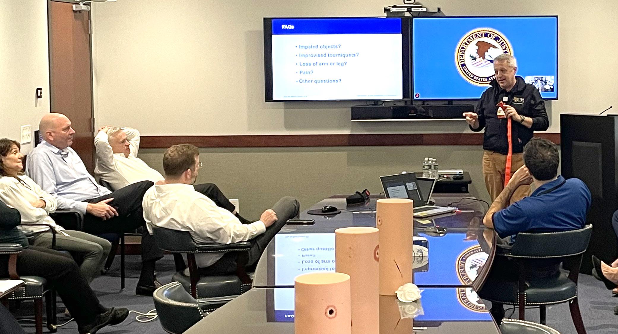 Adam Oplinger, R.N., B.S., C.E.N., T.C.R.N., teaching Stop the Bleed at the United States Attorney’s Office for the Western District of New York’s Rochester Branch