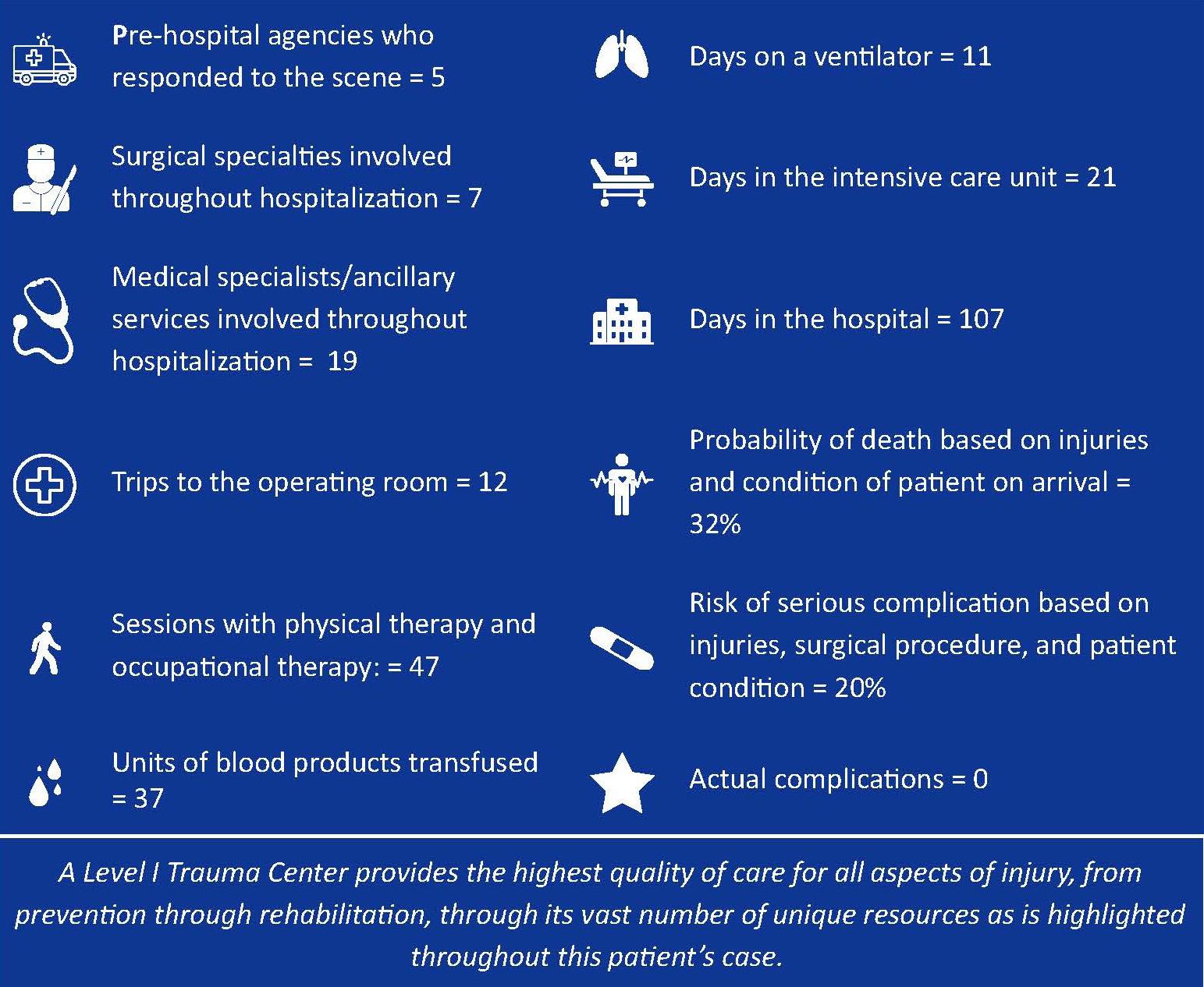 that he would require to safely recover closer to home. As he continued to improve and no longer required inpatient rehabilitation, the social work team was able to coordinate his discharge directly to his home. The patient ultimately underwent his final operative procedure on hospital day 89 and was discharged to his home on hospital day 107 with the ability to walk using a rolling walker. Prior to leaving, our patient was so thankful for his care that he recorded a special video message to be