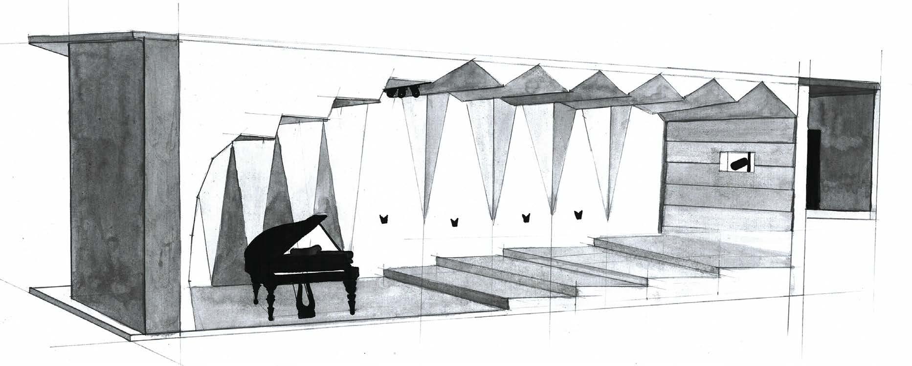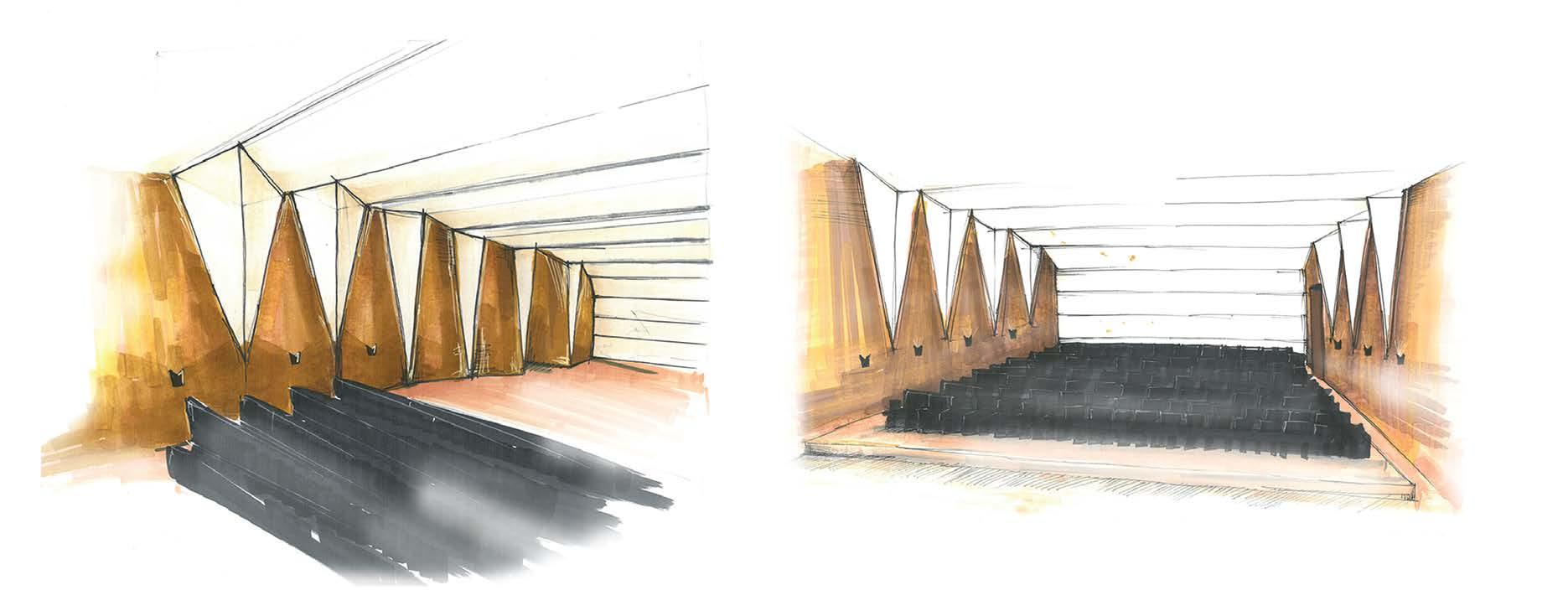 The back of the stage has been arched to ensure uniform sound distribution, while from the auditorium, the stage area has been reduced to create an illusion of more space. Additionally, an end stage type without a curtain has been implemented to provide a modern and minimalist look.