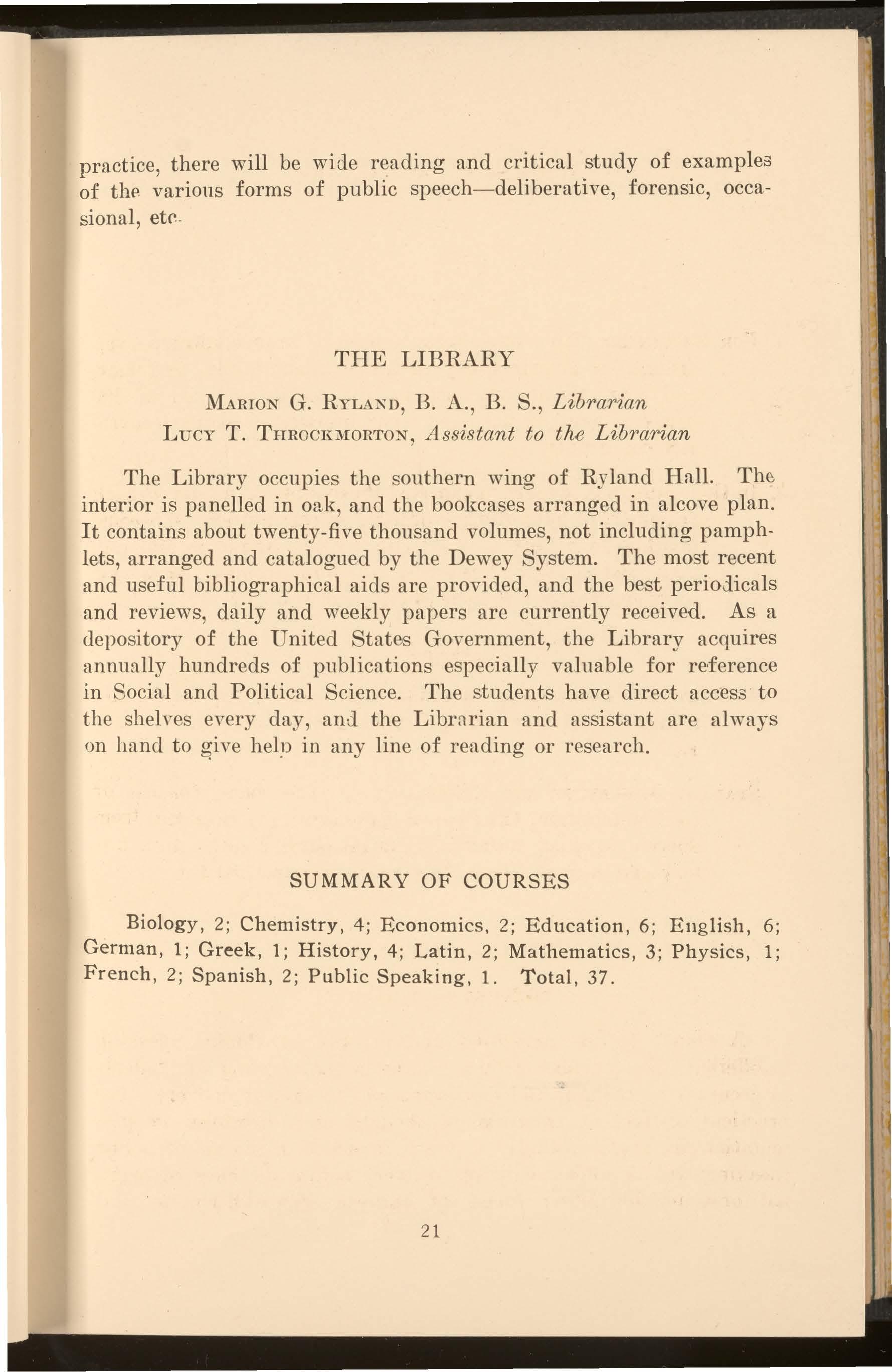 The Library occupies the southern wing of Ryland Hall. The, interior is panelled in oak, and the bookcases arranged in alcove plan. It contains about twenty-five thousand volumes, not including pamphlets, arranged and catalogued by the Dewey System. The most recent and useful bibliographical aids are provided, and the best perioJicals and reviews, daily and weekly papers are currently received. As a <lepository of the United States Government, the Library acquires annually hundreds of publications especially valuable for reference in Social and Political Science. The students have direct accesa to the shelves every day, and the Librnrian and assistant are always on hand to give hel)) in any line of reading or research.