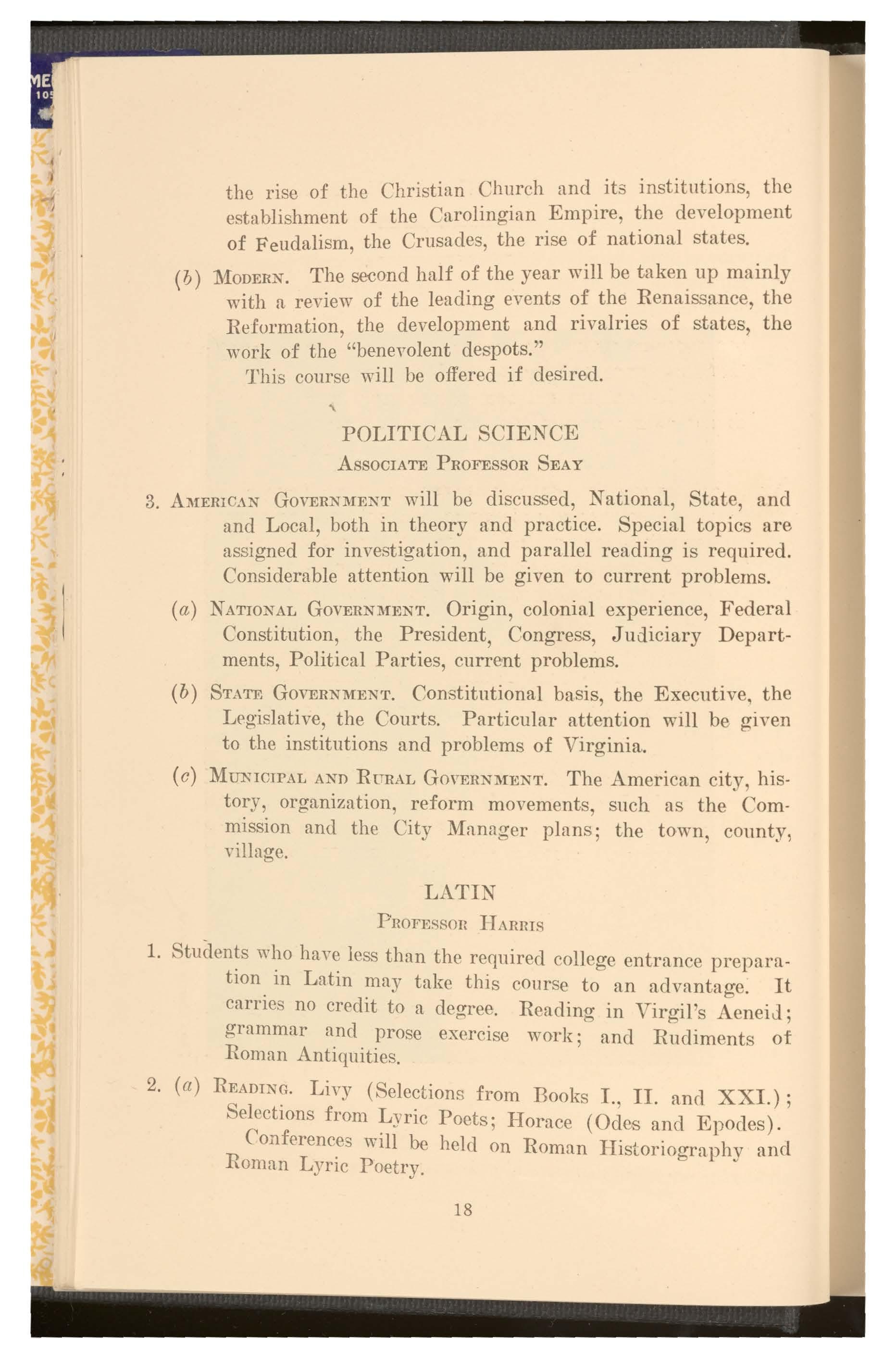 (b) STATEGOVERNMENT.Constitutional basis, the Executive, the Legislative, the Courts. Particular attention will be giYen to the institutions and problems of Virginia.