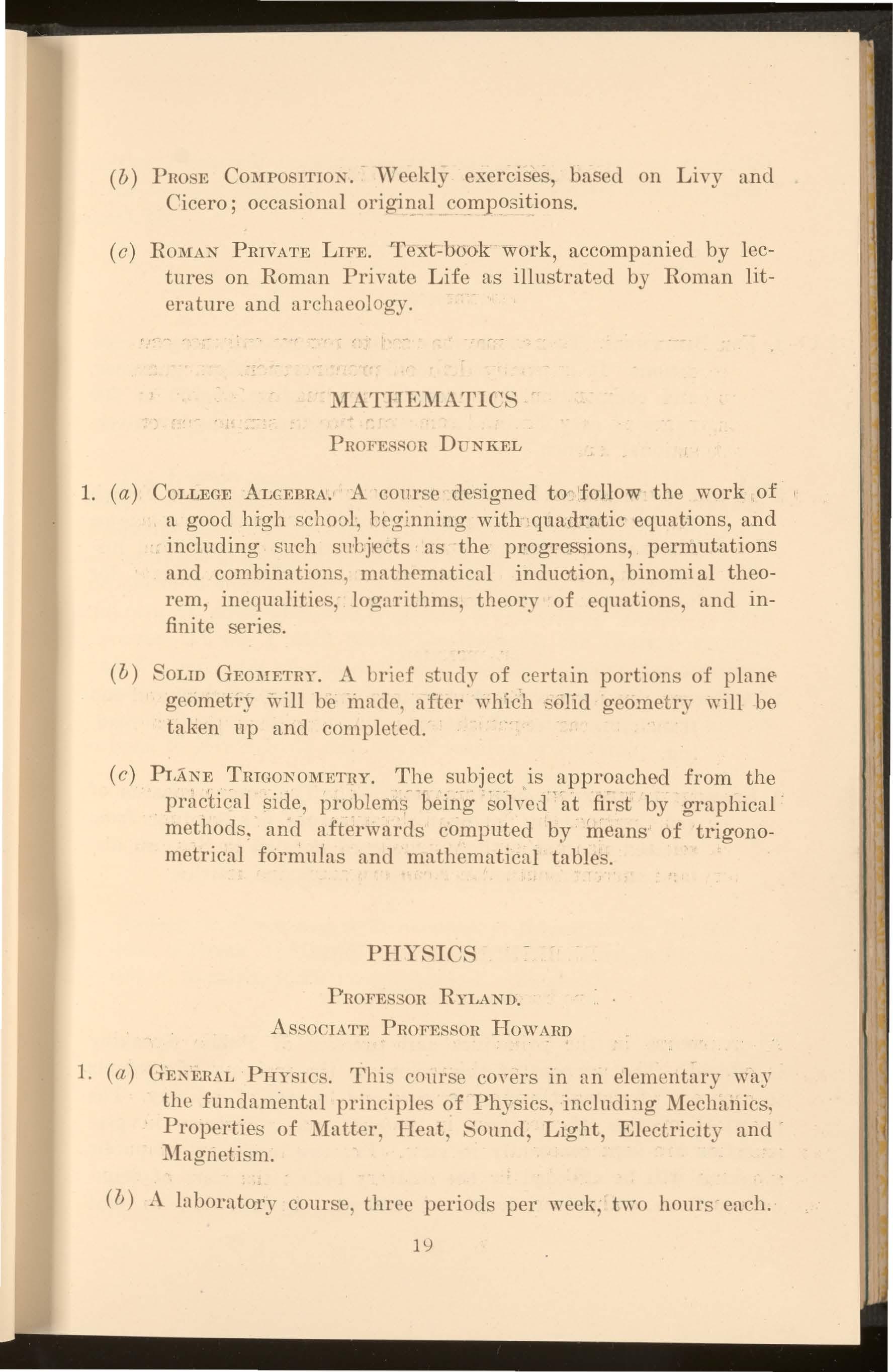 1. (a) CoLLEGEALGEBRA. A co11rse designed to ~ follow the work of , a good high school, beginning with ,quadratic equations, and including such snbj~cts as the progressions, permutations and combinations , mathematical induotion, binomial theorem, inequalities, logarithms, theory of equations, and infinite series.