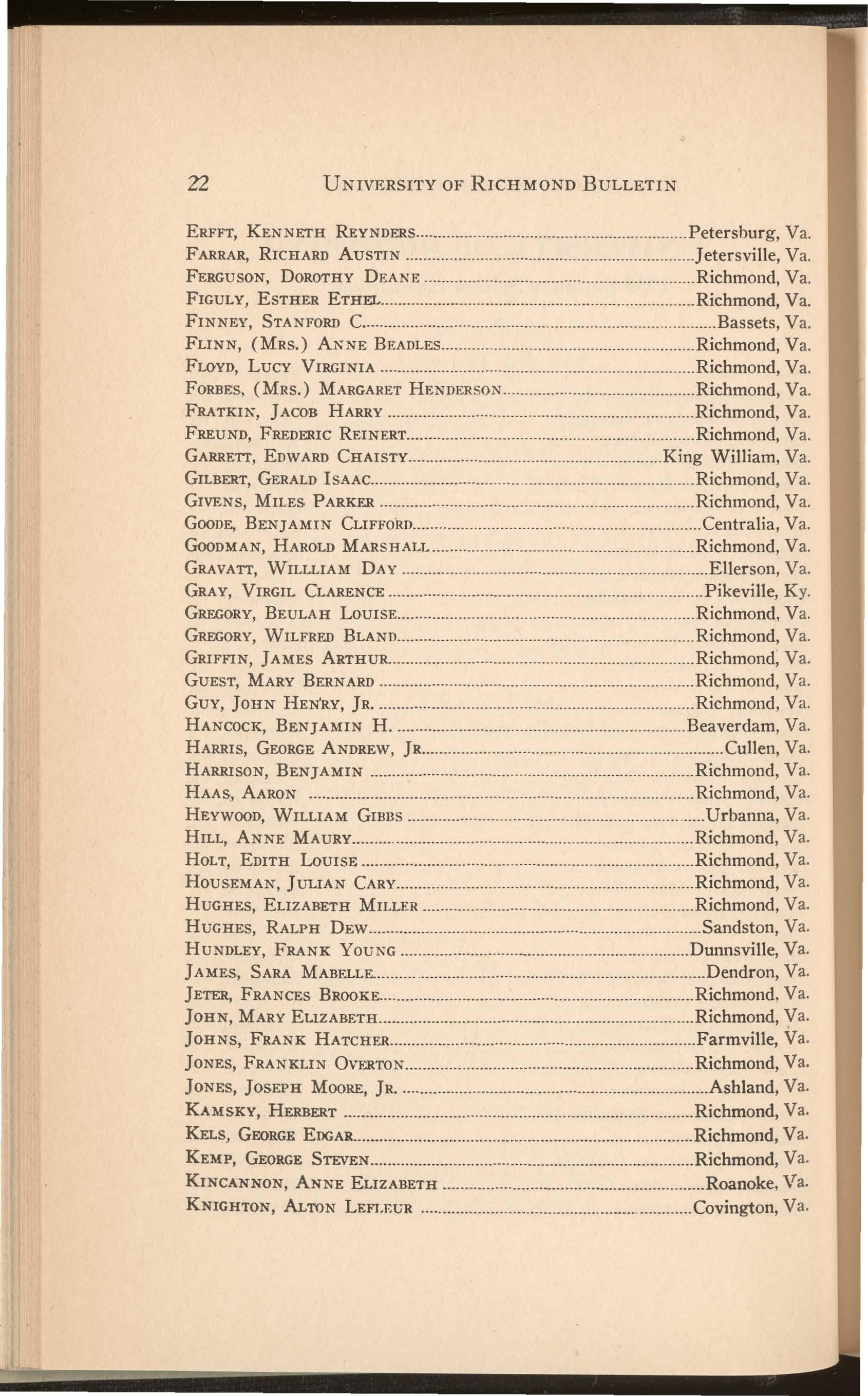 LEVITIK,BERNARD.............................................................................Portsmouth, Va. LEVY,EDWIN Lours, JR Richmond, Va. LLOYD,ROBERTC1n!JLIN Richmond, Va. LOUTHAN,MILDREDALMIDA Richmond, Va. LEITZ, FRANCIS EARLE............................................... ......................Richmond, Va. McALLISTER, CECIL GuY Richmond. Va. McNEILL, ROBERTBOLLING......................................................... ........Richmond, Va. MAHER,JosEPH FRAKKLIN......... Richmond, Va. MARSHALL,BEVERLEYWELLFORDRANDOLPH....................................Richmond, Va. MASON,ROBERTLEE ..............................................................................Ridgeway, Va. MATHEWSON,PHILIP LAMBETH........................................................Richmond, Va. MEACHAM,]AMES LuTHER..................................................................Richmond, Va. MITCHELL,FANNIE BELLE....................................................................Richmond, Va. MITCHELL,MILDREDBoYD................................................................... Richmond, Va. MOORE,ETHEL WILMORE Richmond, Va. MORRISON,ALFREDHrLL ........................................................................Hanover, Va . MYRICK,MILDREDWINTON Norfolk. Va. NENON,ULMER HUNT ........................................................................... Chatham, Va. NUNNALLY,FRANK MALONE Petersburg, Va. ORcurr, DAVIDBENJAMIN, ]R. Moseley, Va. ORSCHEL,JOSEPH EDWARD Richmond, Va. OWENS,MAYSVILLE]ANE Cumberland, Md. PACE, EDITH ARRINGTON Richmond, Va. PATTEN,]AMES BOYD,JR Midlothian, Va. PAYNE, ANNE DUDLEY.................................... Richmond, Va. PERCIVA L, MARY MILDRED Richmond, Va PIEROTTI,JOSEPH ]OHN Richmond, Va. PLOTKIN,MAx Lours................................... Richmond, Va. PooLE, SARAH ELIZABETH... Richmond, Va. POND,CHARLESBAILEY Suffolk, Va. RAGLAND , ARLENEWELSH Brook Hill, Va. RAIFORD, FLETCHER,L. Franklin, Va. REED,PLEASANTLARUS, 11.. Richmond, Va. RrCE, DAVIDCLARK Richmond, Va. RICH, ARTHUR WILLIAM Sandston, Va. RICHARDS,STUARTKEITH Richmond, Va.