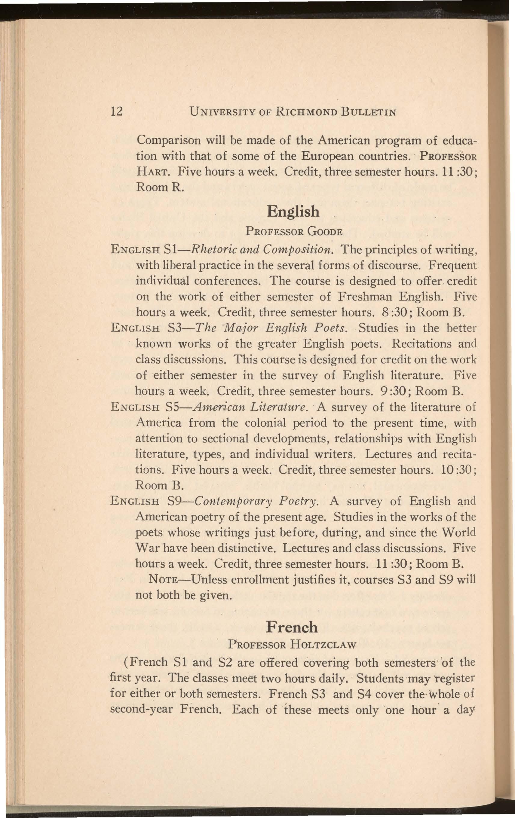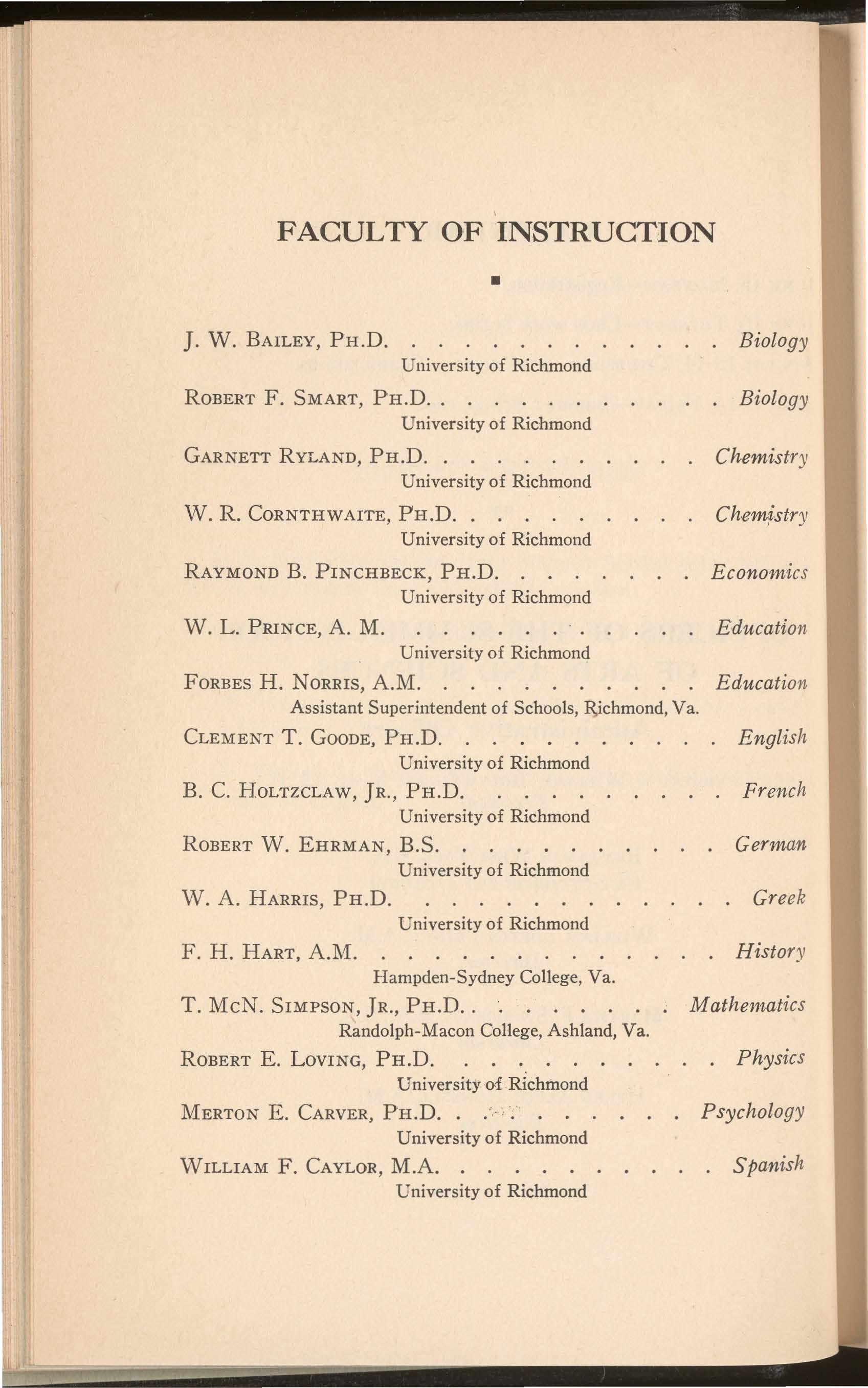 The Summer Session of the University of Richmond extends through a period of nine weeks. Various courses are offered designed to meet the needs of the following :