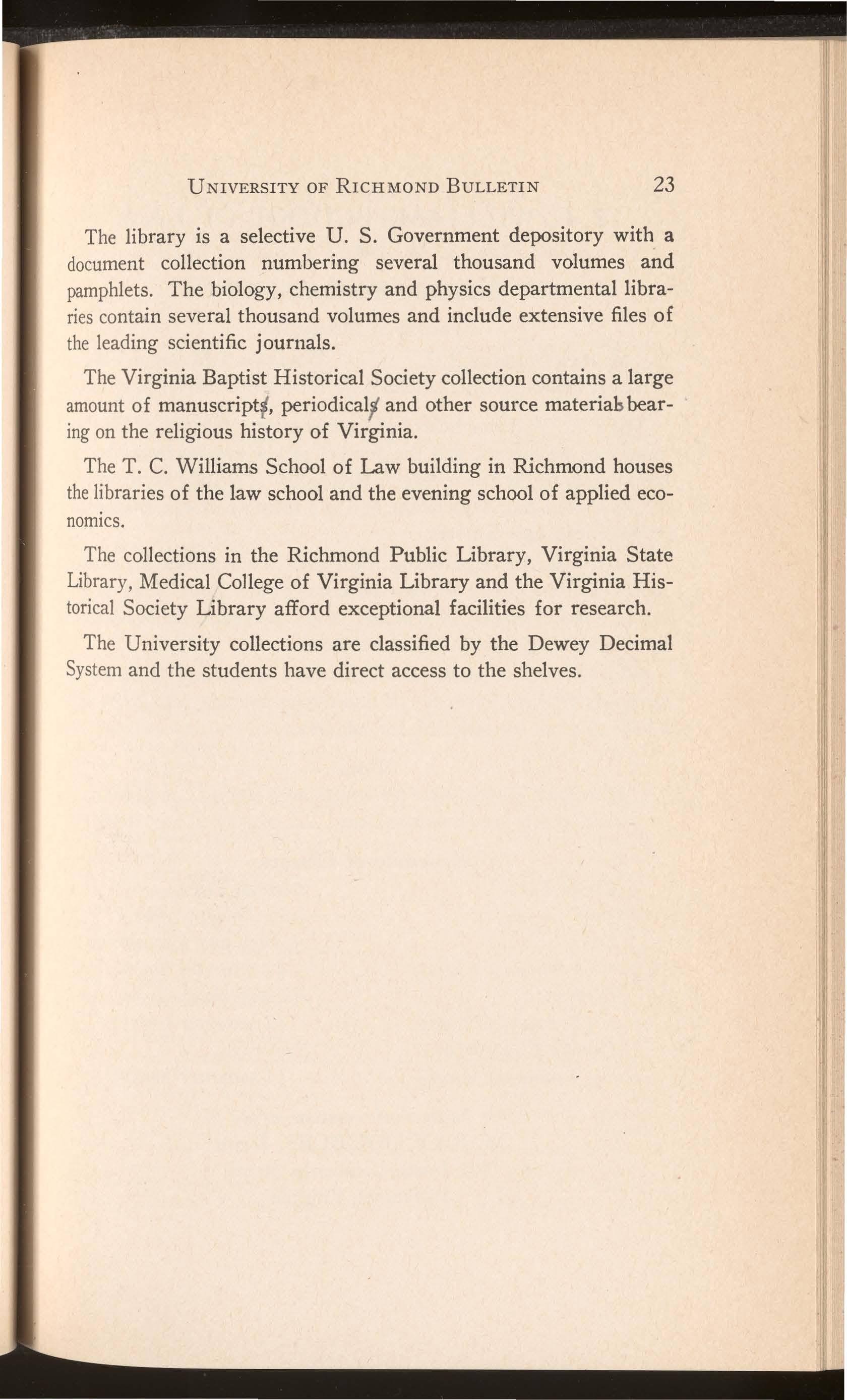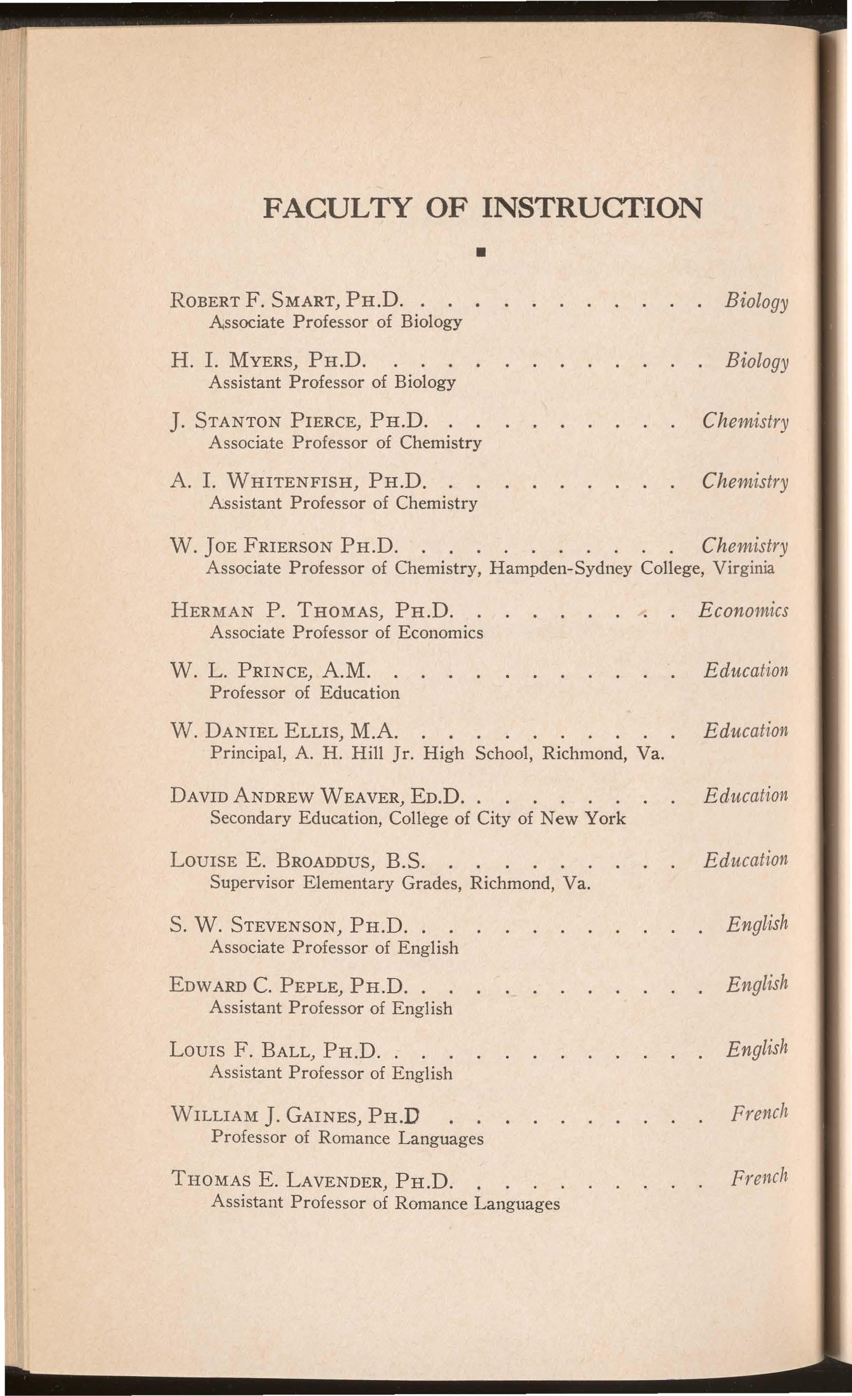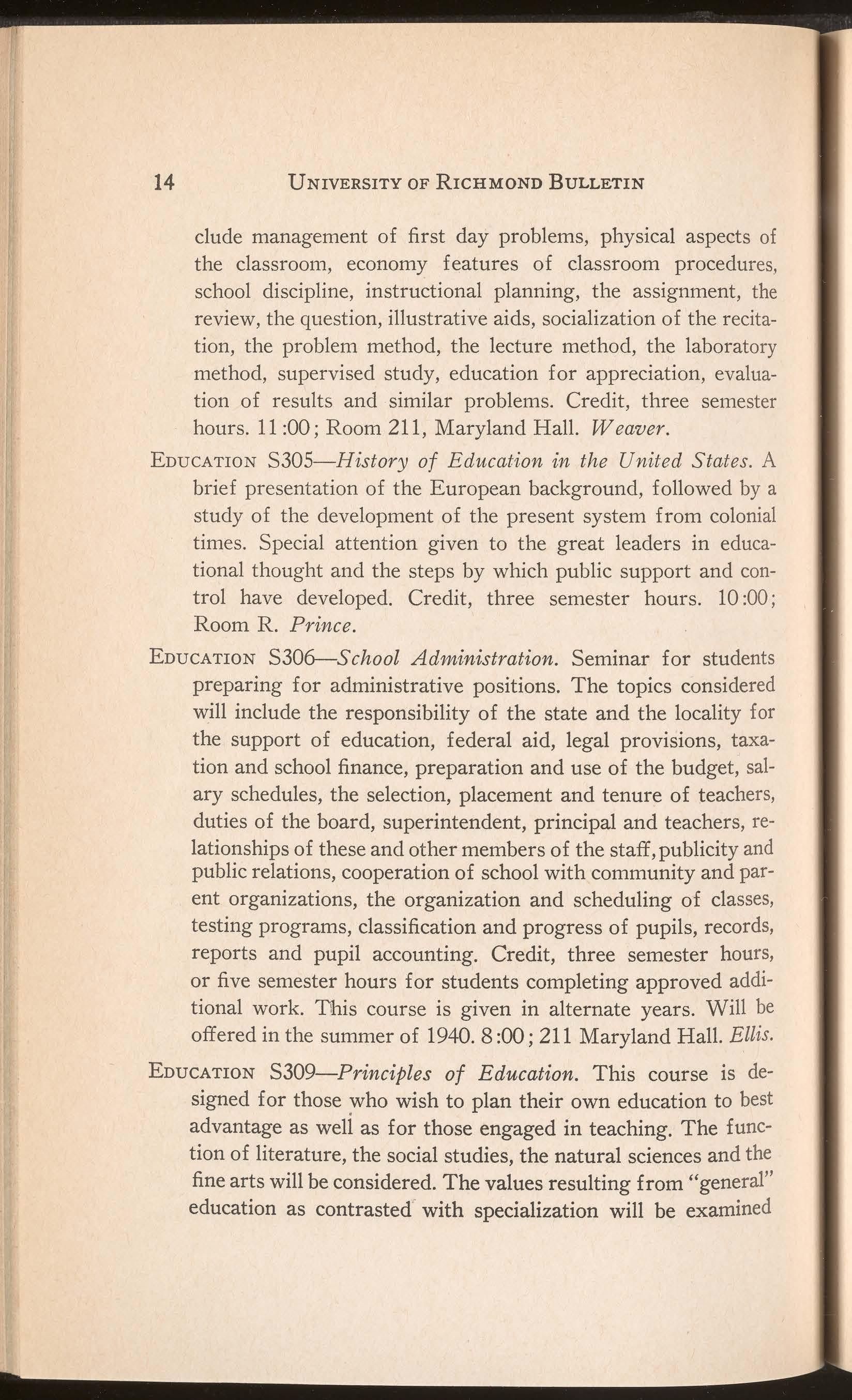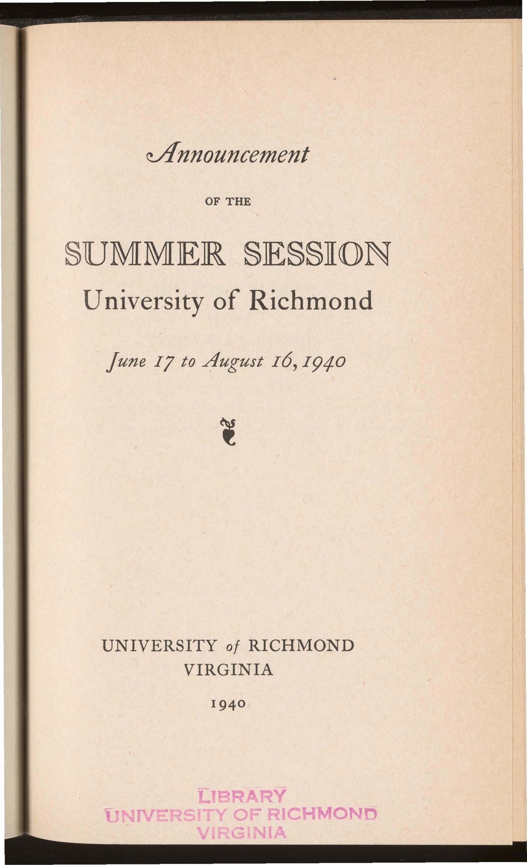 The Summer Session of the University of Richmond extends through a period of nine weeks. Various courses are offered designed to meet the needs of the following: