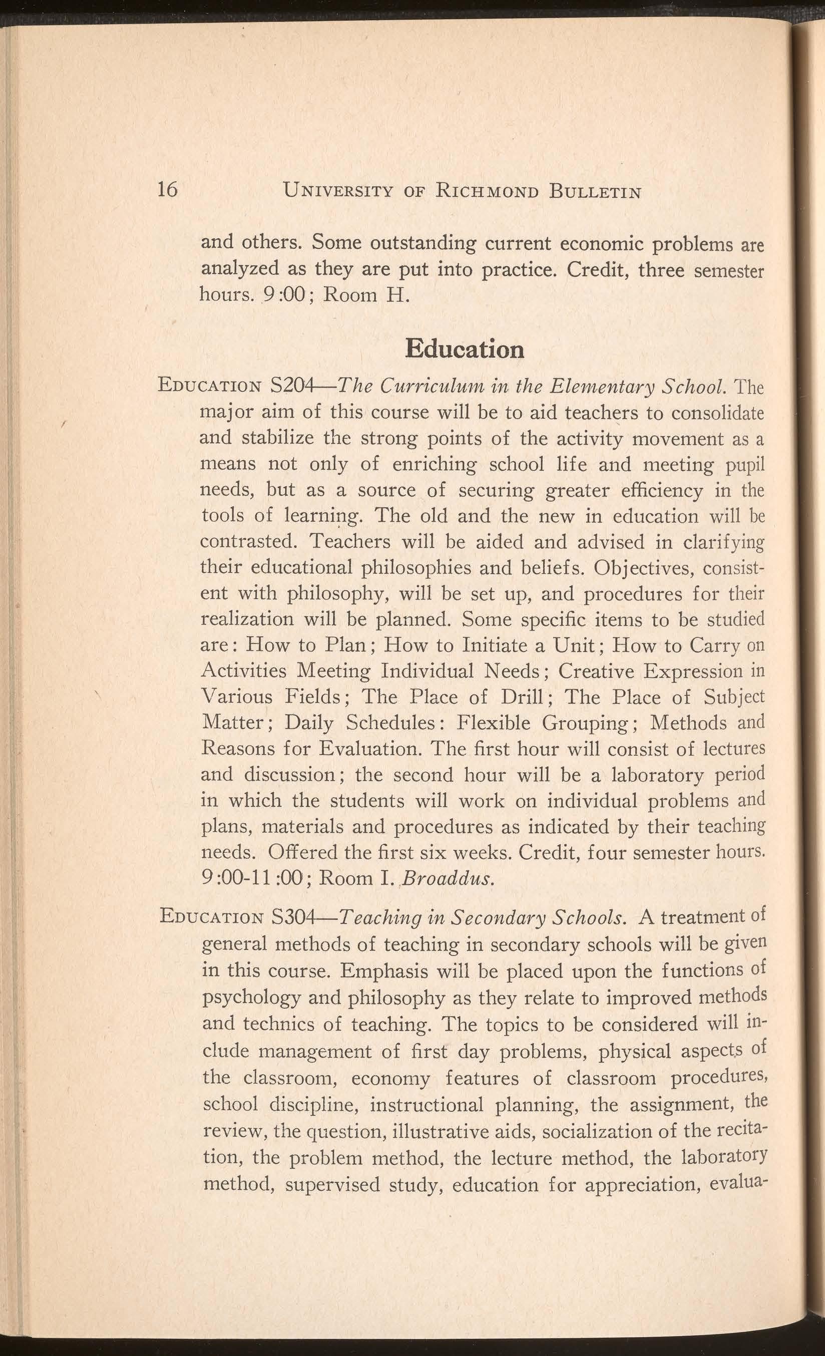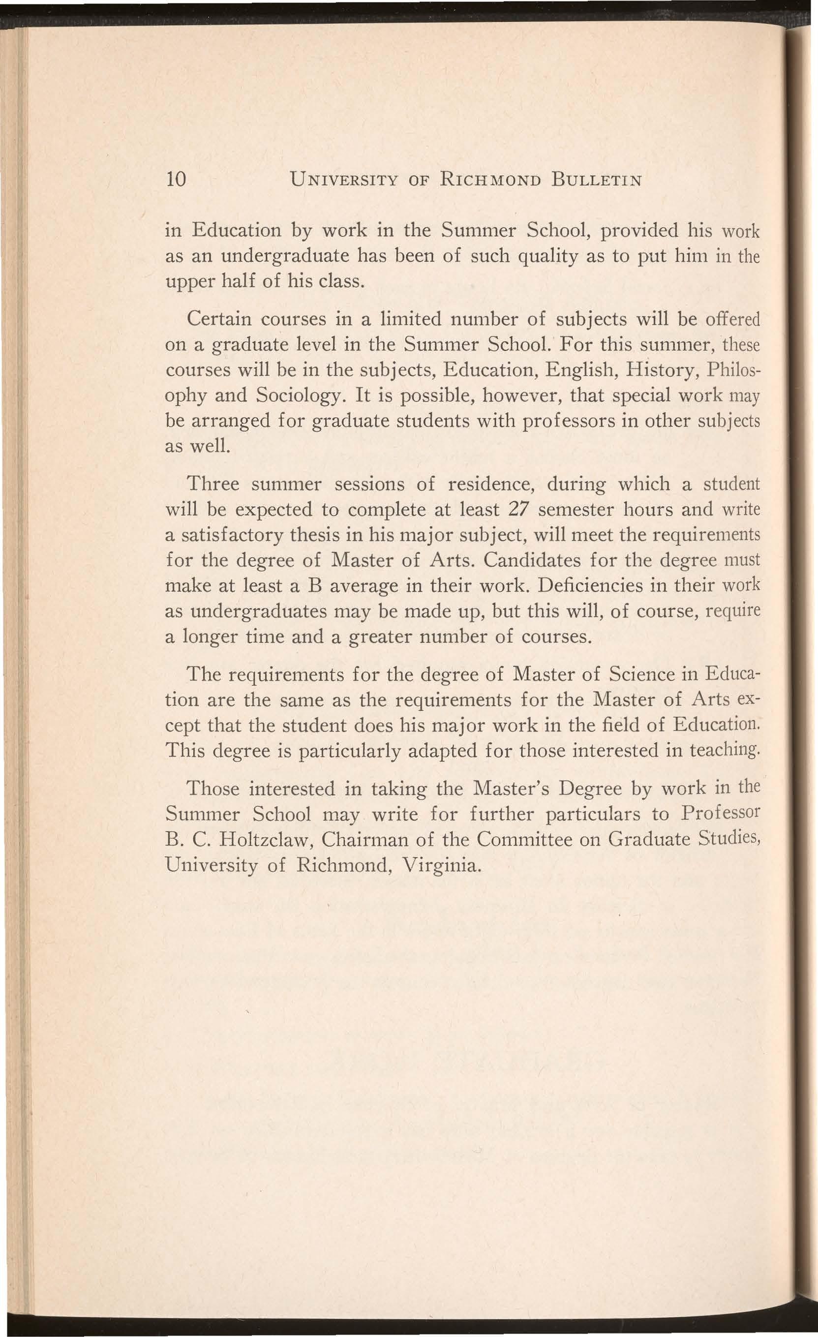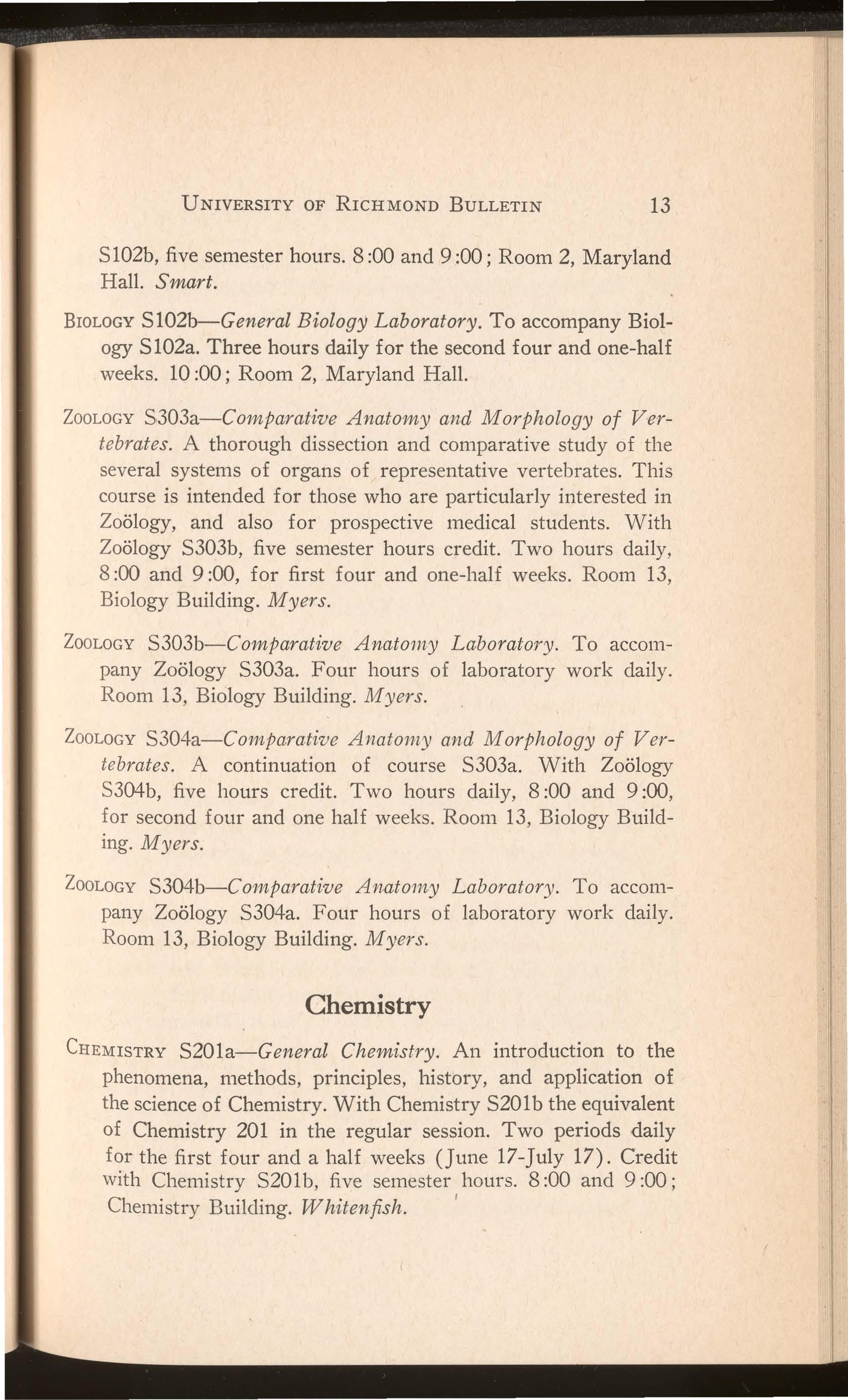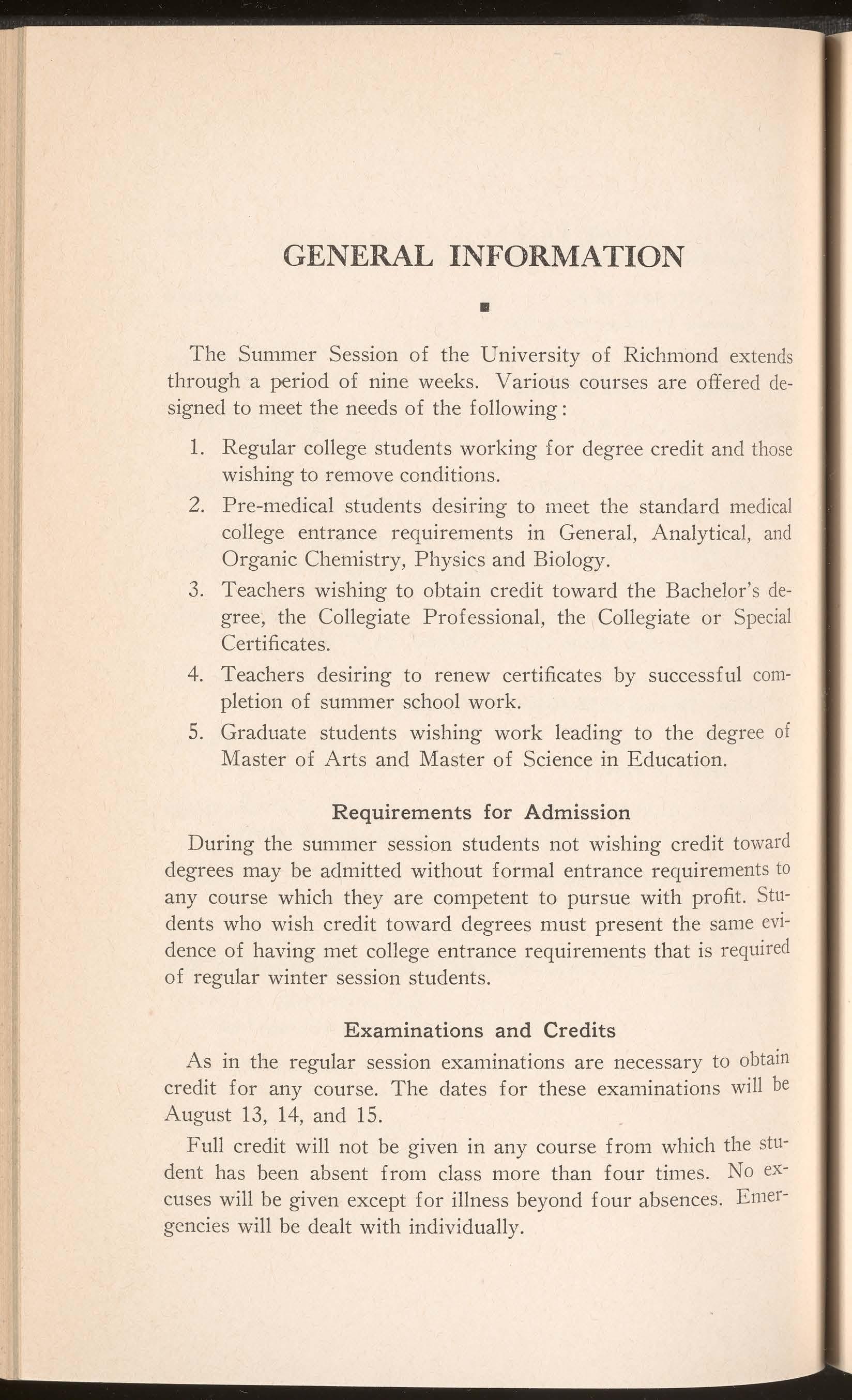 The Summer Session of the University of Richmond extends through a period of nine weeks. Various courses are offered designed to meet the needs of the following :