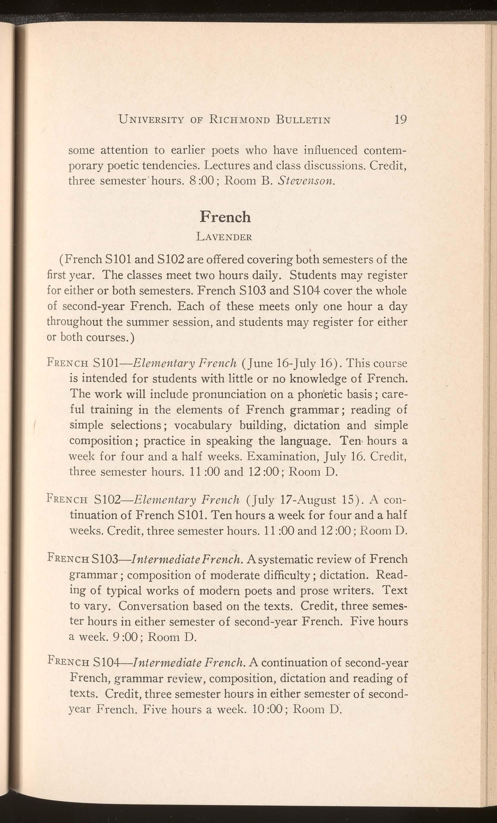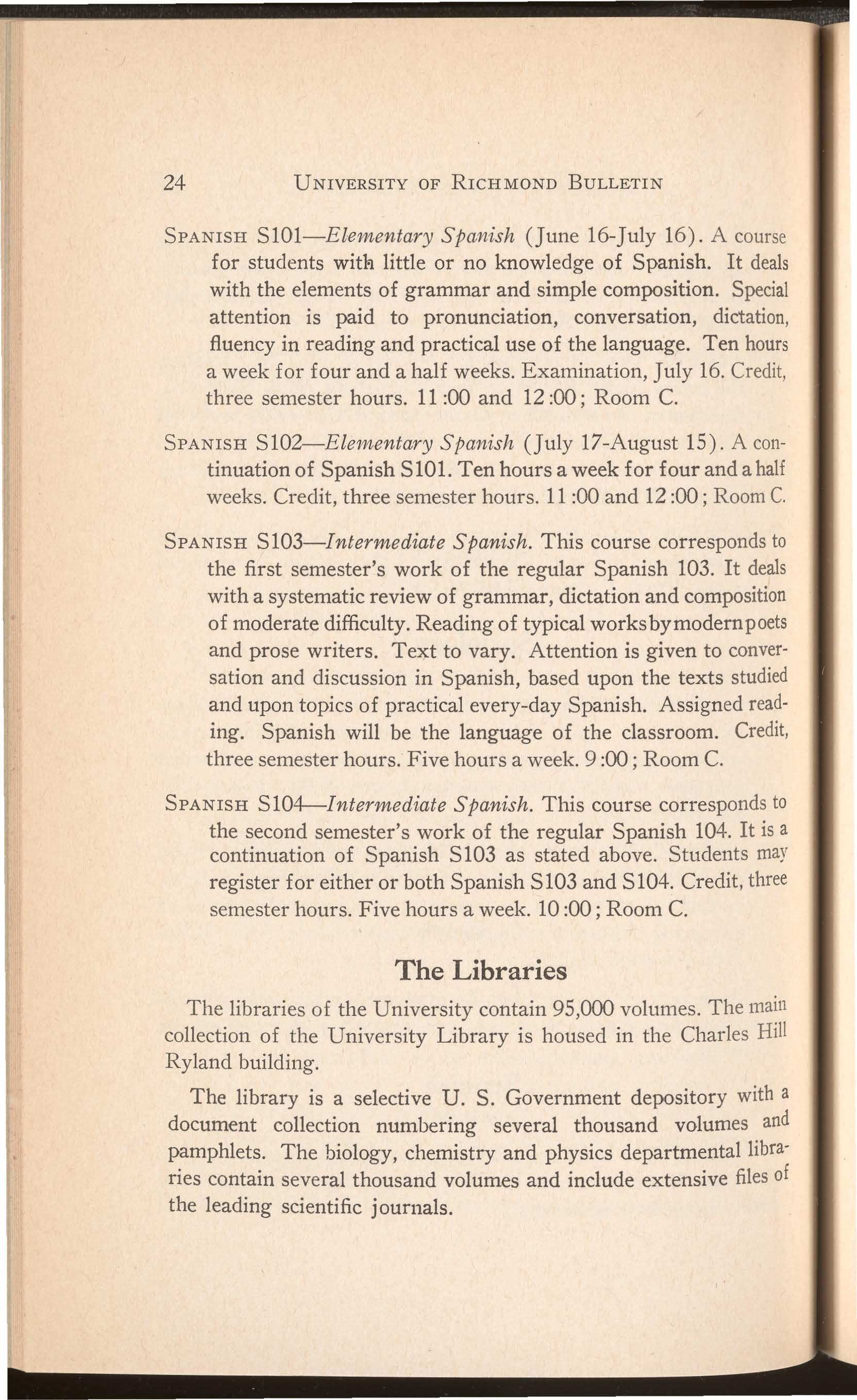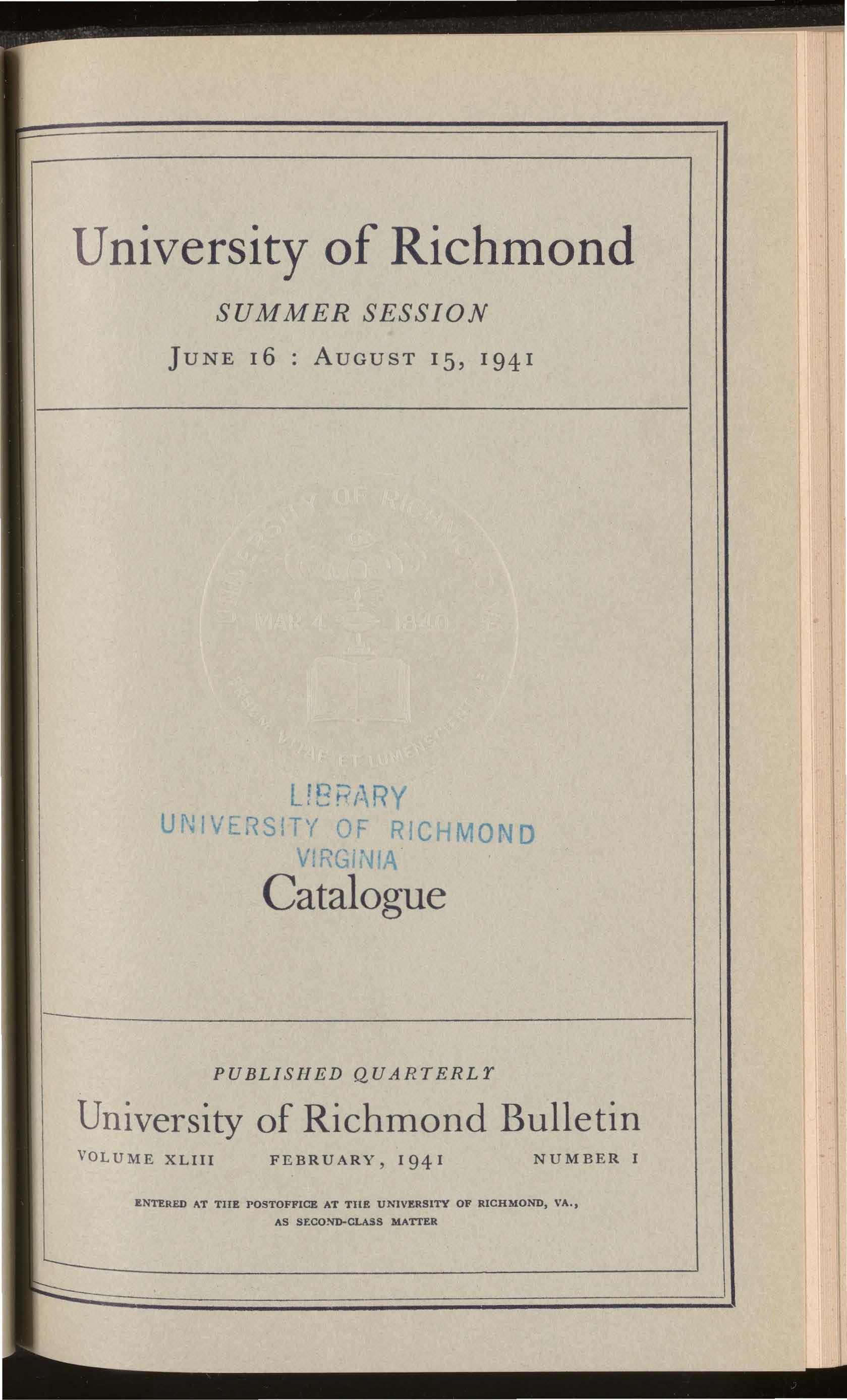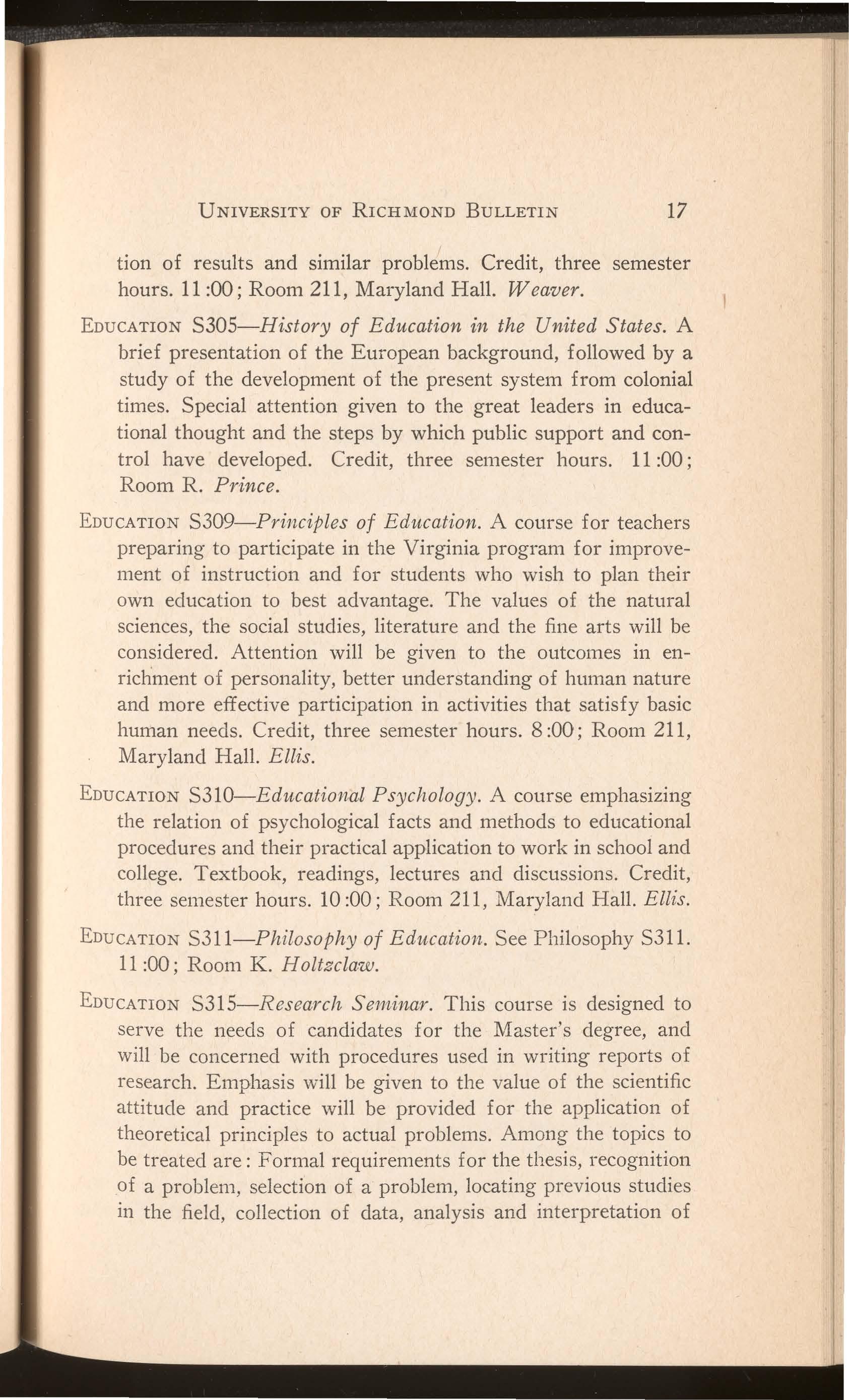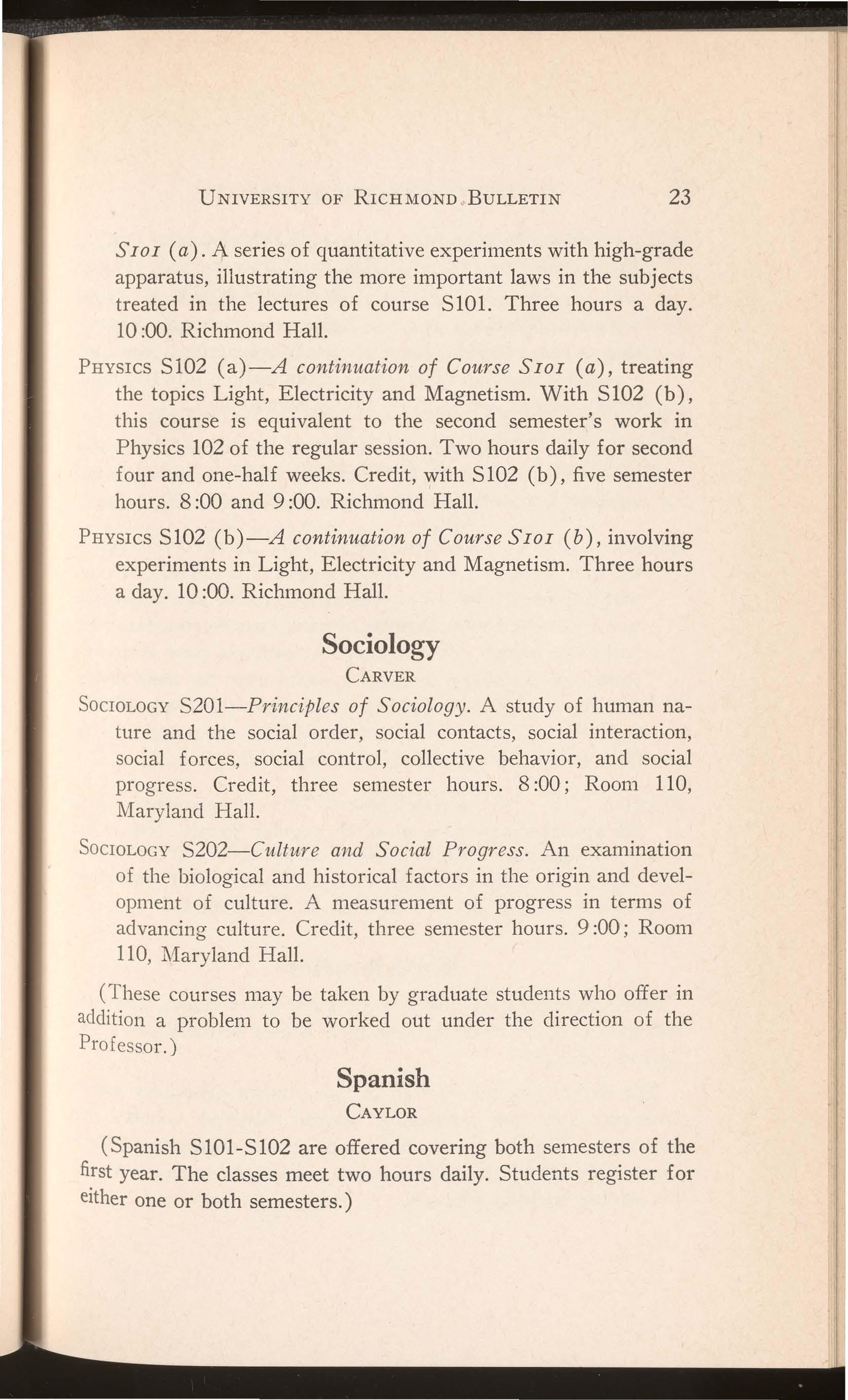 The Summer Session of the University of Richmond extends through a period of nine weeks. Various courses are offered designed to meet the needs of the following :