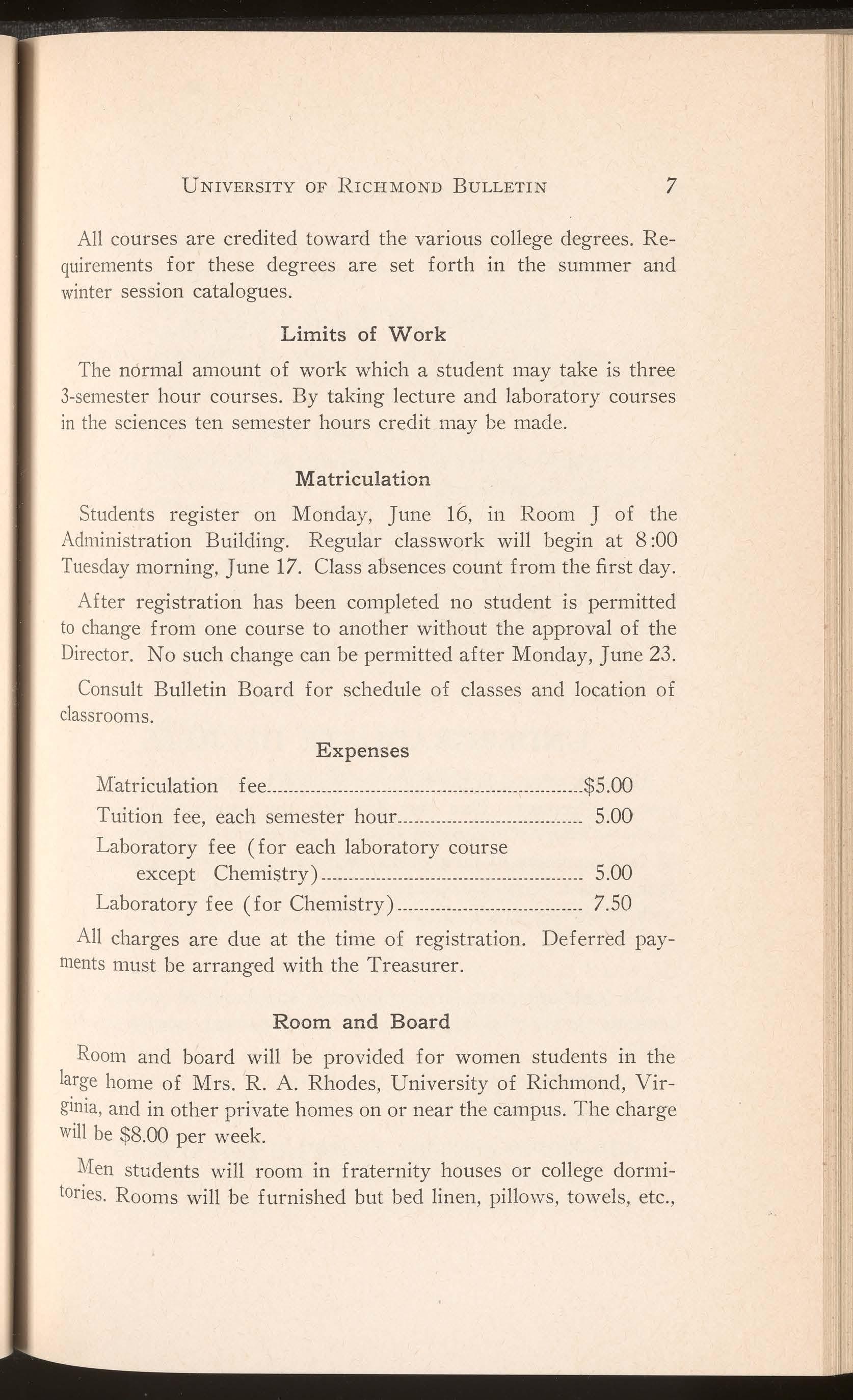 Room and board will be provided for women students in the large home of Mrs. R. A. Rhodes, University of Richmond, Virginia, a nd in other private homes on or near the campus. The charge will be $8.00 per week.