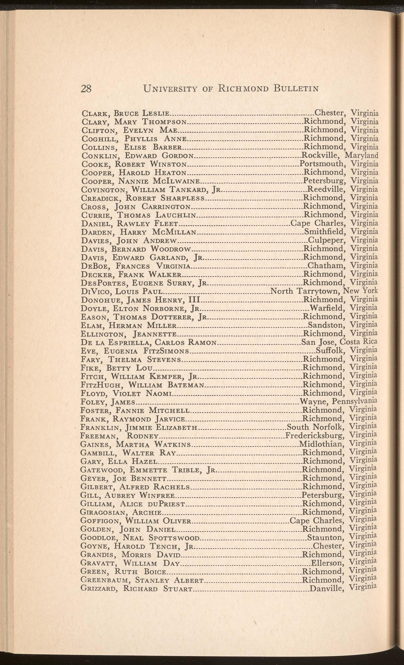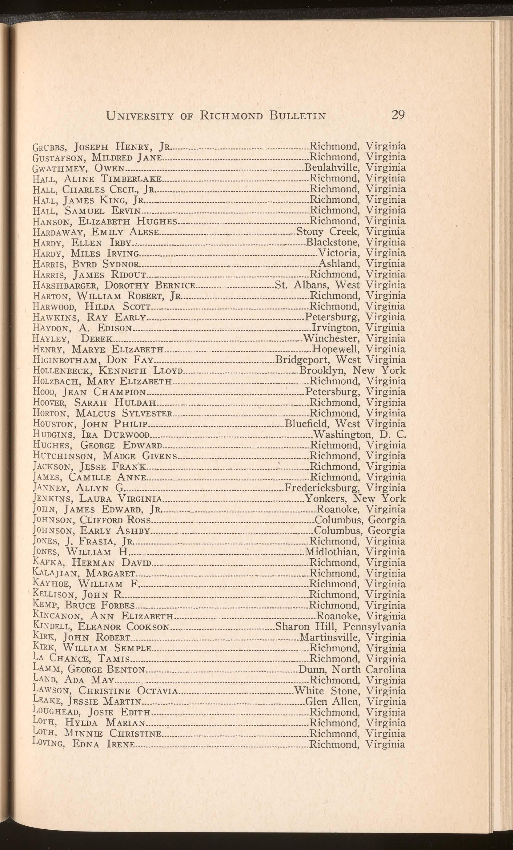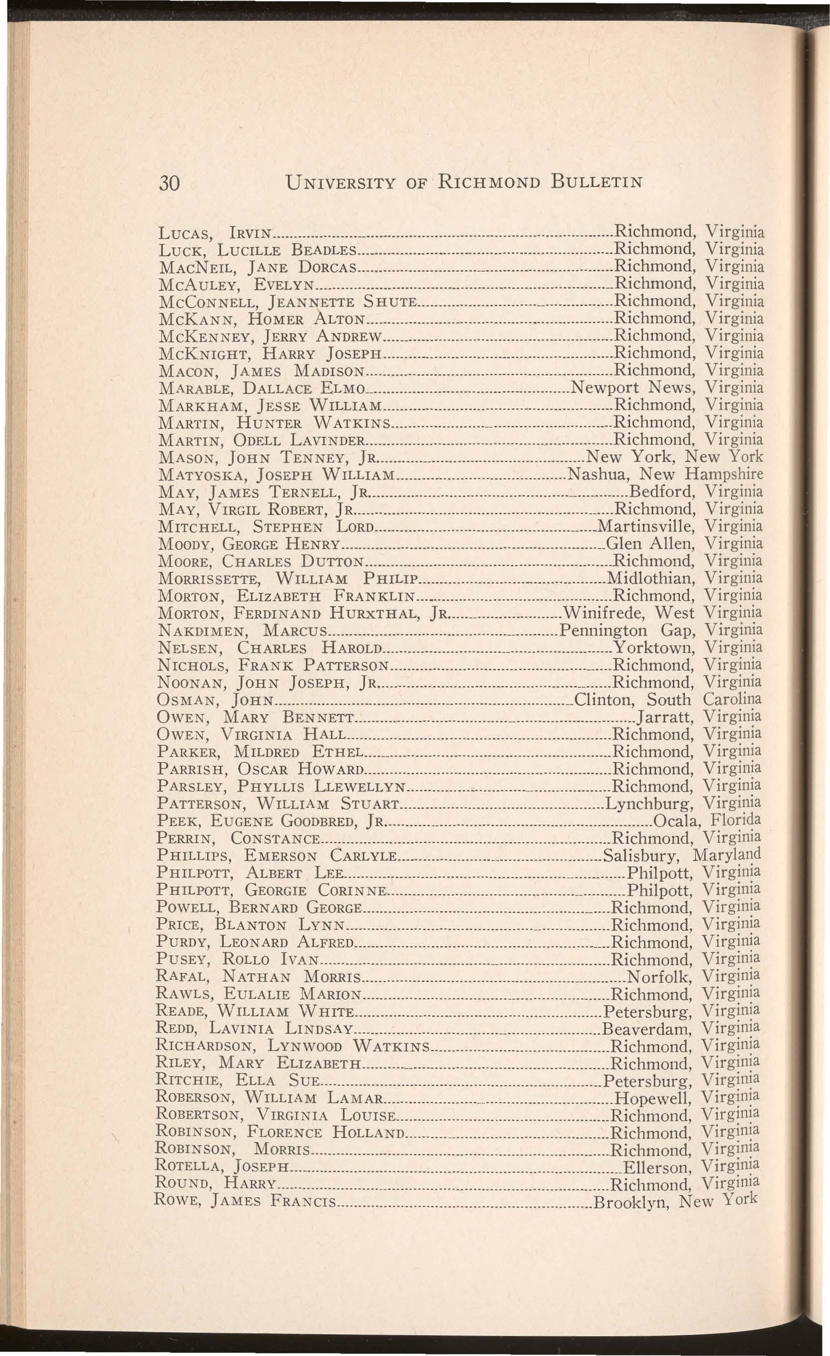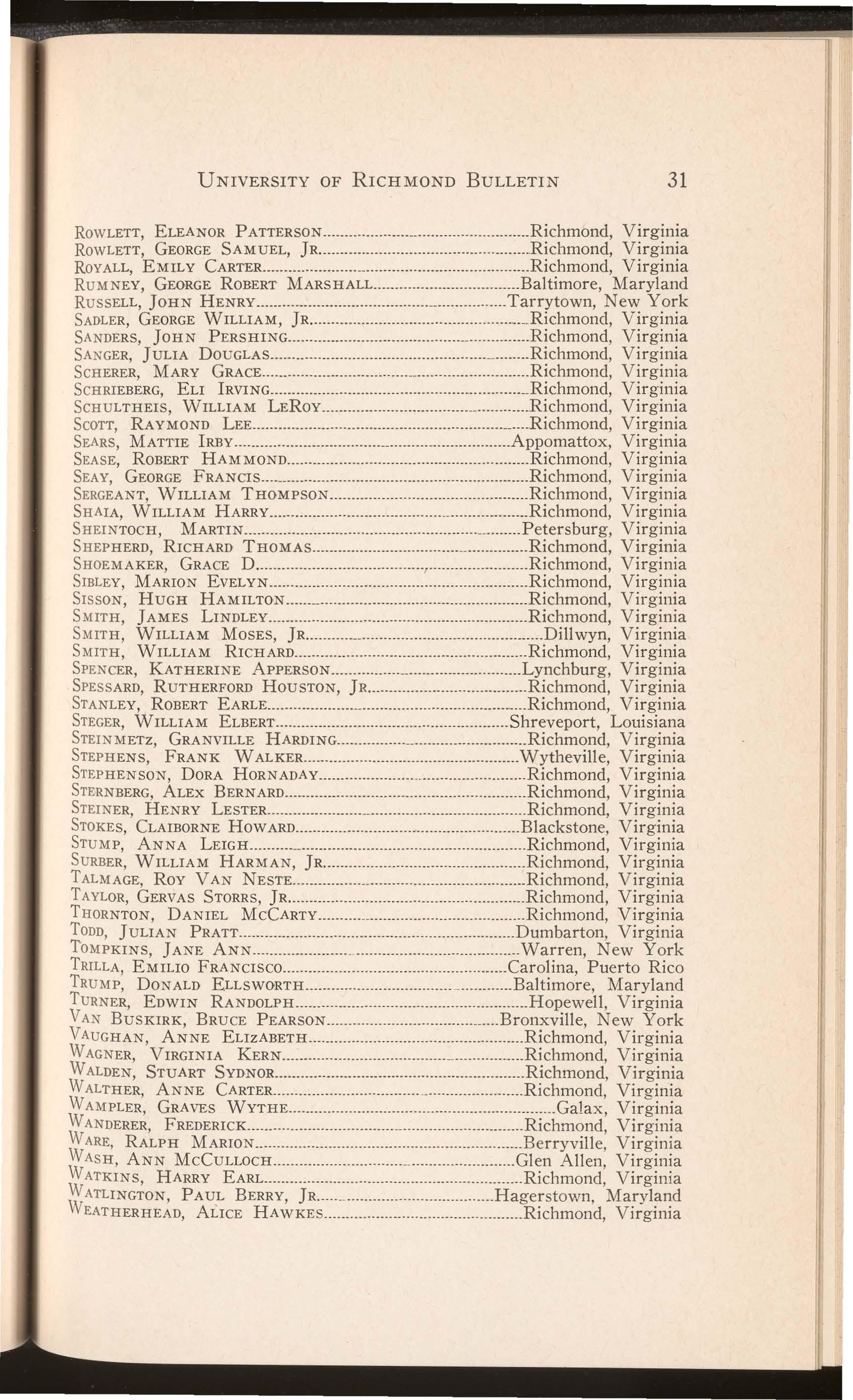 SANGER,JULIA DouGLAS Richmond, Virginia SCHERER,MARY GRACE Richmond, Virginia ScHRIEBERG,ELI lRvING Richmond, Virginia SCHULTHEIS,'vVILLIAMLEROY Richmond, Virginia Scorr, RAYMOND LEE .Richmond, Virginia SEARS,MATTIE !RBY................................................................Appomattox, Virginia SEASE, ROBERTHAMMOND Richmond, Virginia SEAY, GEORGEFRANCIS..............................................................Richmond, Virginia SERGEANT,WILLIAM THOMPSON Richmond, Virginia SHAIA, WILLIAM HARRY............................................................Richmond, Virginia SHEINTOCH, MARTIN Petersburg, Virginia SHEPHERD,RICHARD THOMAS Richmond, Virginia SHOEMAKER,GRACE D , Richmond, Virginia SIBLEY,MARION EvELYN Richmond, Virginia SrssoN, HUGH HAMILTON........................................................Richmond, Virginia SMITH, }AMES LINDLEY Richmond, Virginia