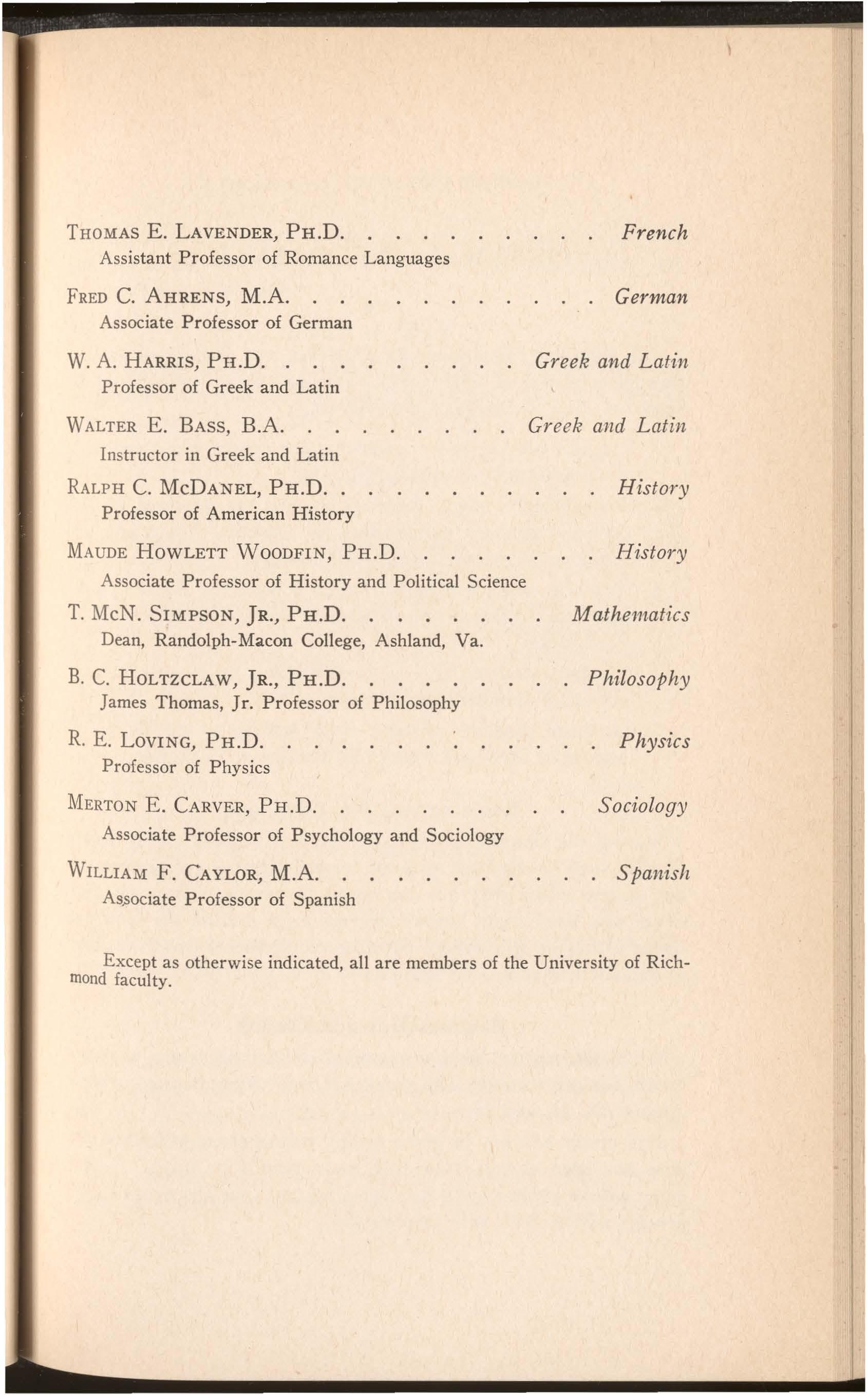 Except as otherwise indicated, all are members of the University of Richmond faculty.