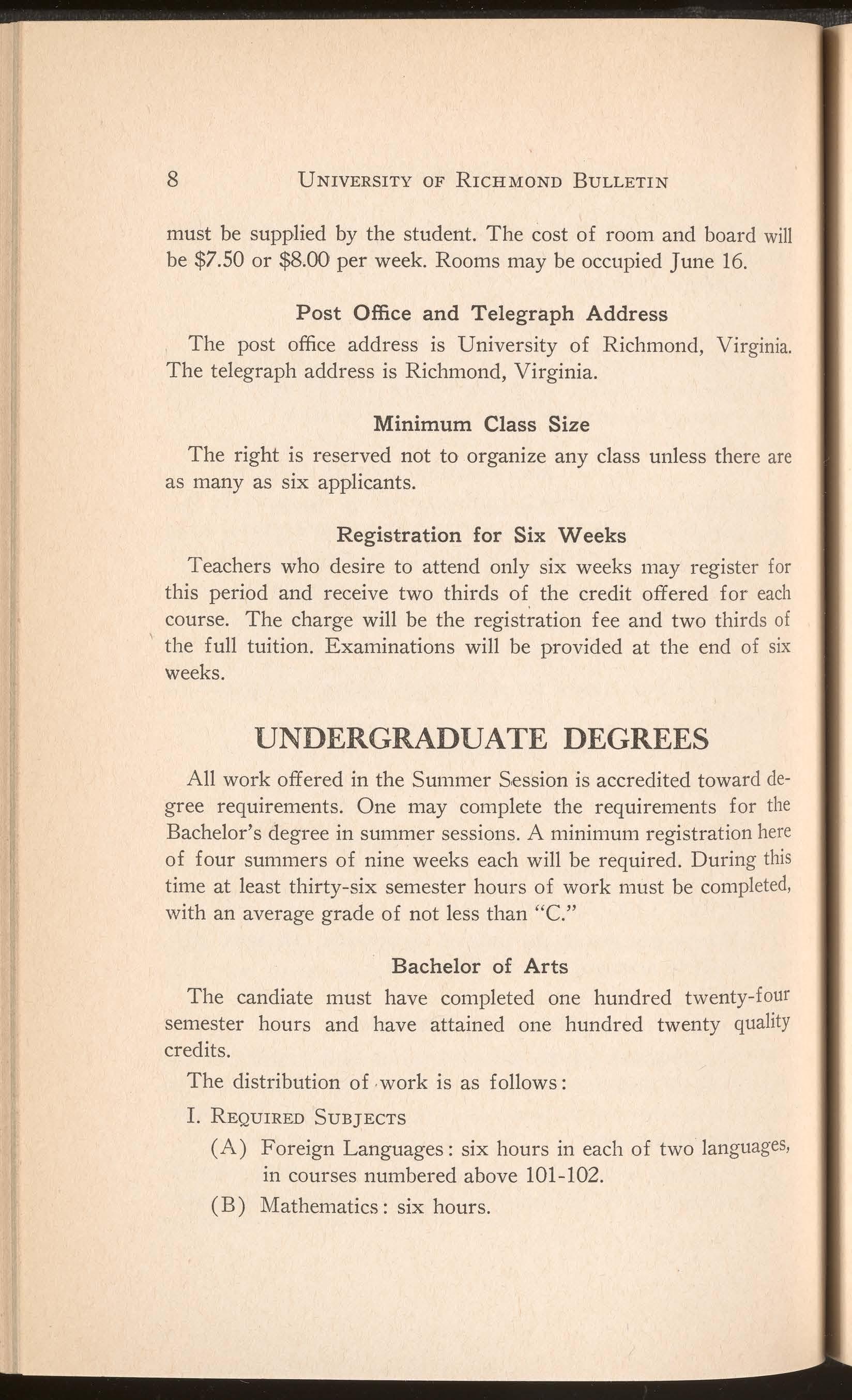 The requirements for these degrees are very similar to those for the Bachelor of Arts except that for the Bachelor of Science the major and the minor must be in the natural sciences, and for the Bachelor of Science in Business Administration the major and minor must consist of forty -eight hours in the fields of Economics and Applied Economics. Additional mathematics must also be taken for these two degrees. For details, consult the Richmond College catalogue.