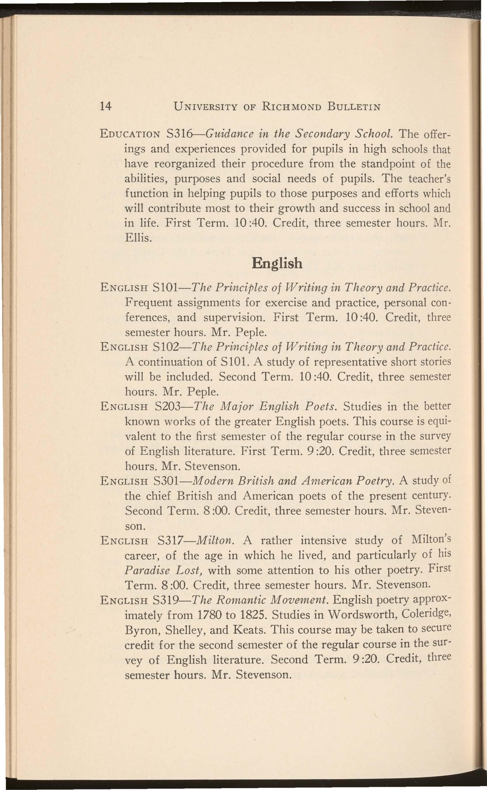The 1944 Summer Session of the University of Richmond will extend through a period of twelve weeks, June 9-August 31. This will be divided into two terms of six weeks each. All classes will meet five days a week. The length of the class periods will be seventy-five minutes. This program will enable one to earn a semester's credit in each course taken for either term.