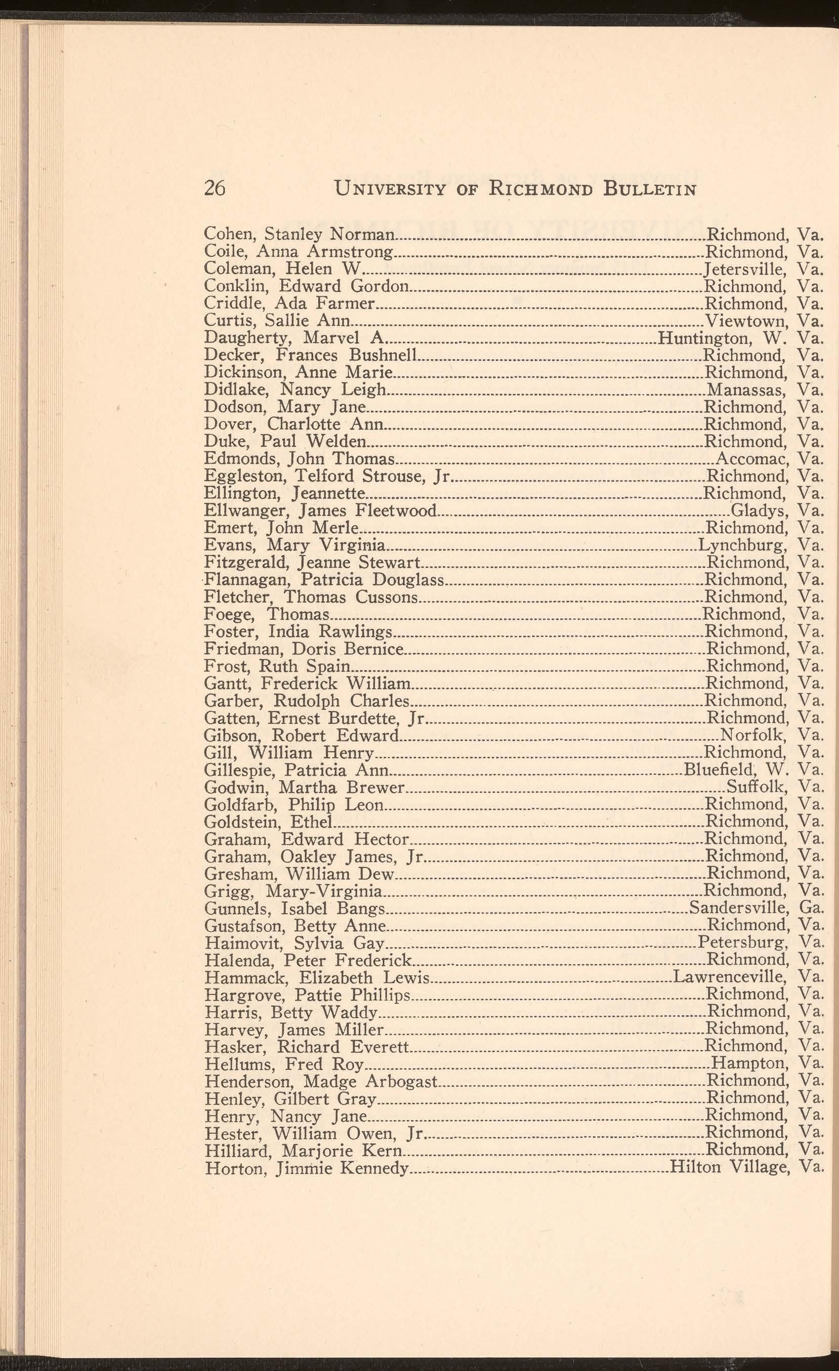 Allen, Marian Vaughan Petersburg, Va. Allen William Glenn, Jr .......................................................................Emporia, Va. Amy~s, Muriel Florence ..................................................................San Marino, Cal. Anderson, Zuleime Cartersville, Va. Arjona, Sylvia Elena ..........................................................................Lynchburg, Va. Ashby, James Richard Richmond, Va. Baldwin, Harry Webster, Jr .Irwin, Va. Bambacus, Grace ....................................................................................Richmond, Va. Baxter, Lincoln, 11 Richmond, Va. Beattie, Ann vValker ................................................................................Ellerson, Va. Belk, Barbara Ella ................................................................................Richmond, Va. Belk, Jane Bruce Richmond, Va. Berrocal, Carlos Simon ......................................................Mayaguez, Puerto Rico Bethel, Mary Frances Richmond, Va. Bigger, Dorothy N eal... .......................................................................Richmond, Va. Bingham, Howie Brock. W everton, Md. Blacker, Melvin Robert ......................................................................Petersburg, Va. Black-Schaffer, A. Robin ....................................................................Durham, N. C. Boulden, Robert J ames Richmond, Va. Bowdler, Betty Hodges ........................................................................Richmond, Va.