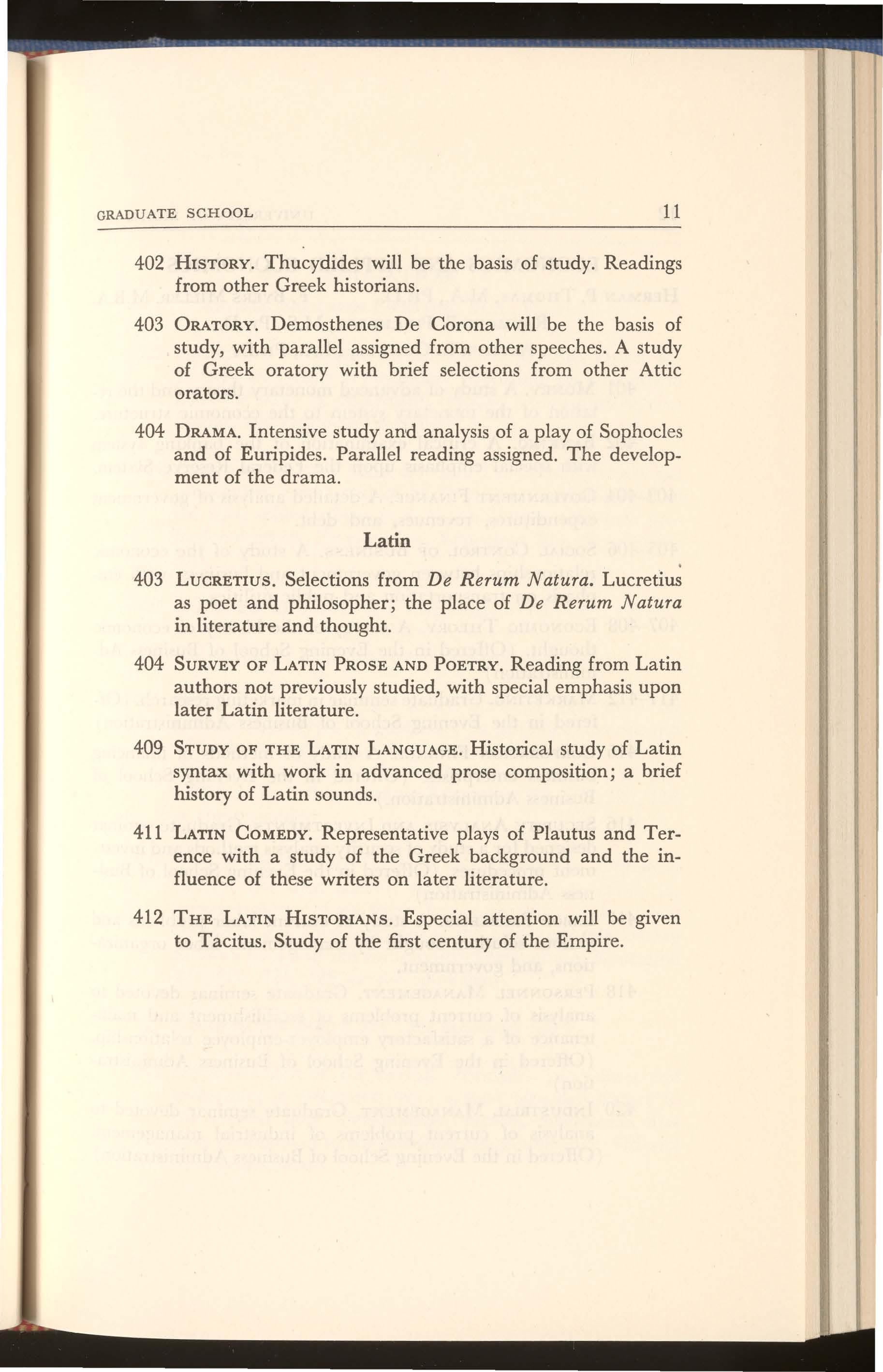 404 SURVEYOF LATIN PROSEANDPOETRY.Reading from Latin authors not previously studied, with special emphasis upon later Latin literature.