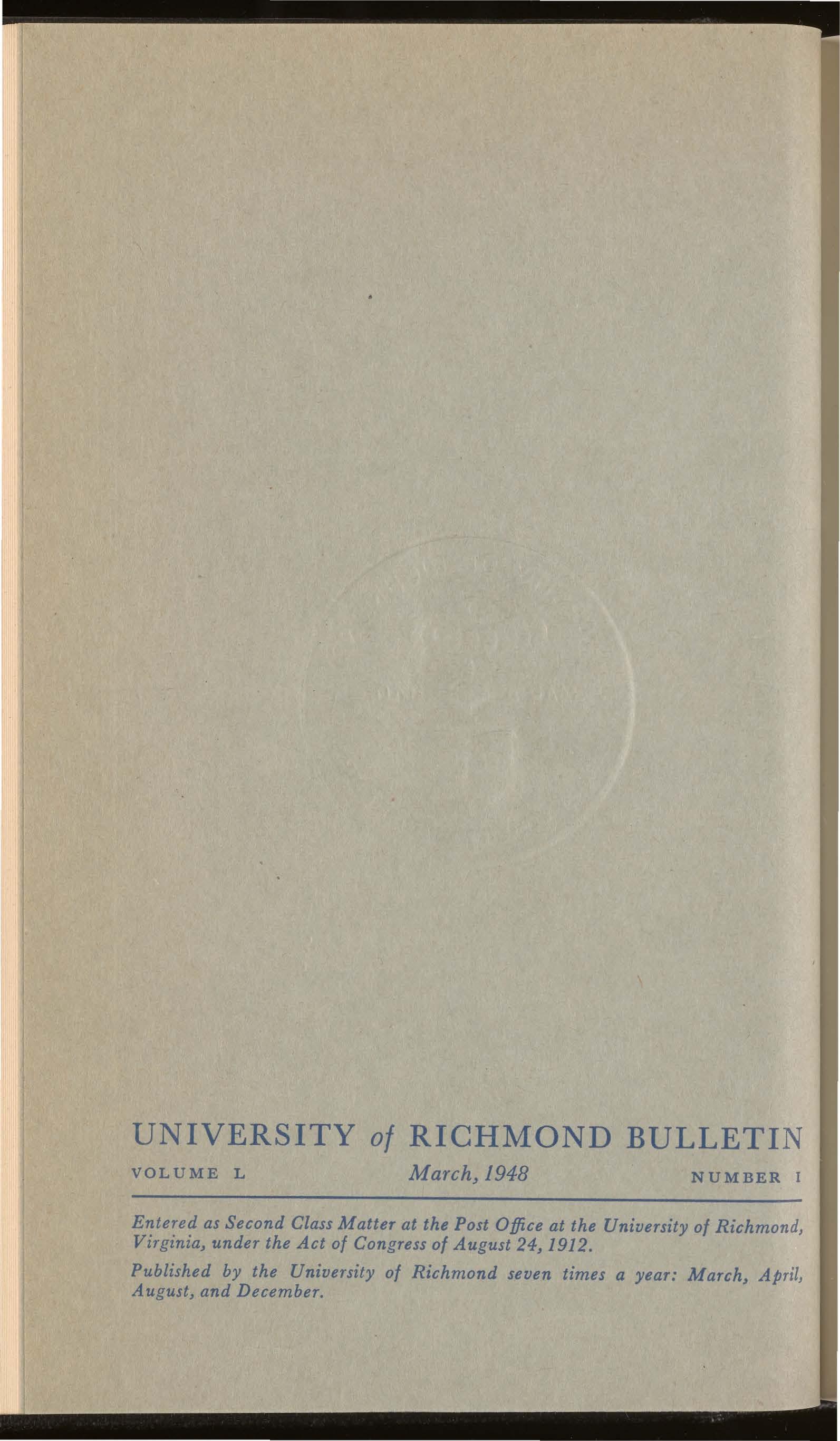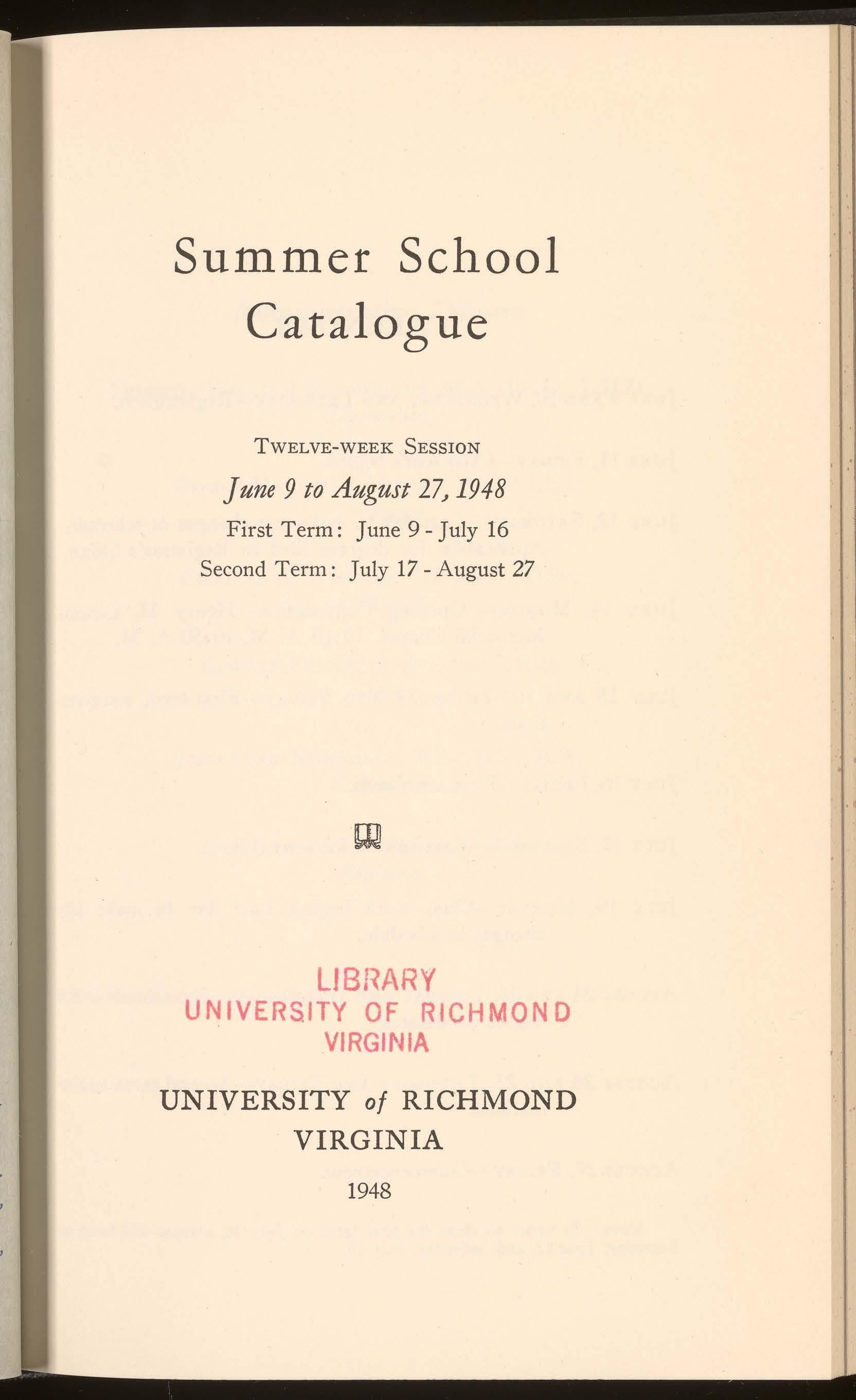 The 1948 Summer Session of the University of Richmond will extend through a period of twelve weeks, June 9-August 27. This will be divided into two terms of six weeks each. All classes will meet five days a week. The length of the class periods will be seventy-five minutes. This program will enable one to earn a semester's credit in each course taken for either term.
