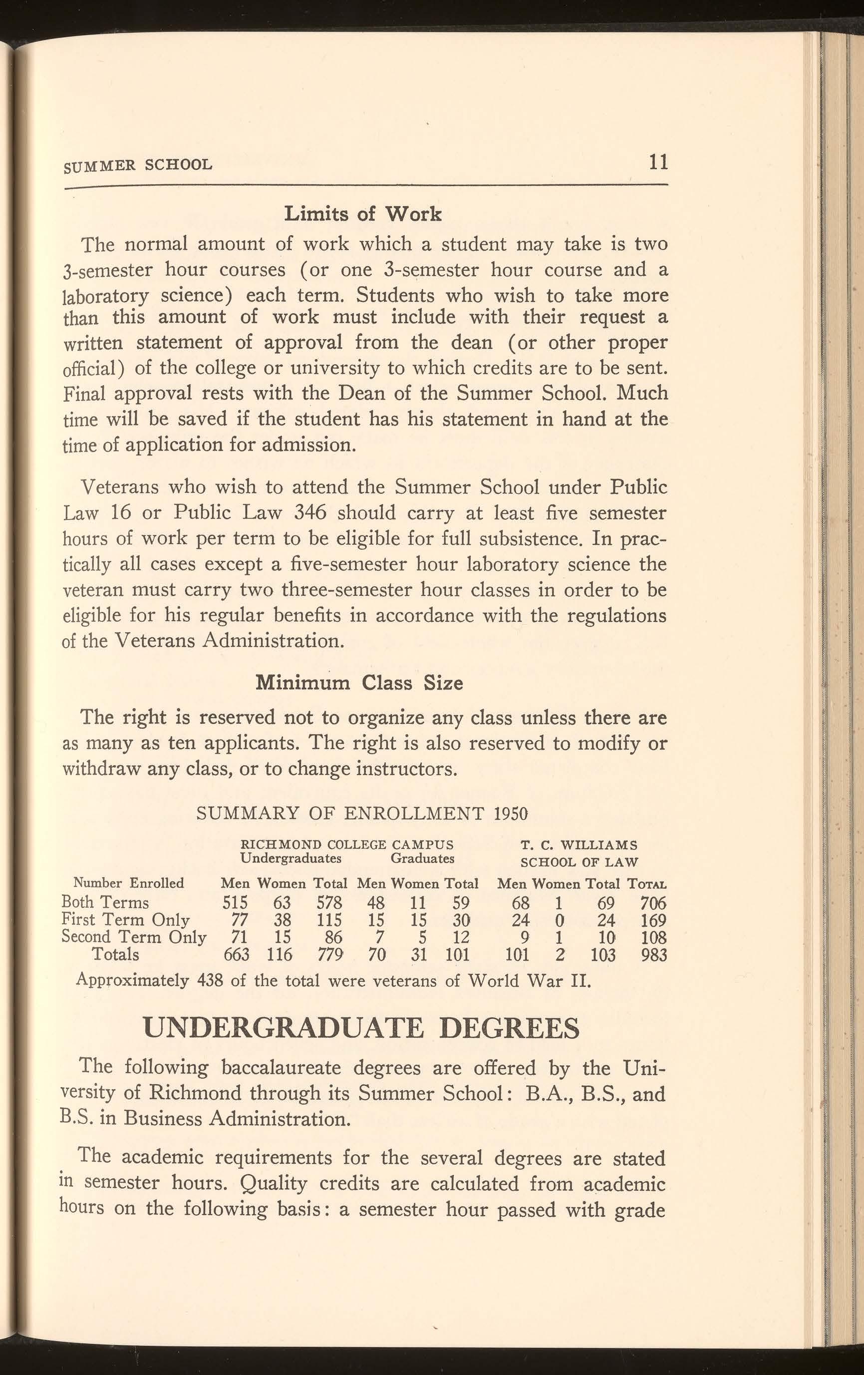 Established in 1920, the Summer School became the fourth school in the University of Richmond. The first of the six divisions of the University of Richmond was Richmond College, founded in 1832, as a college of liberal arts and sciences for men. The remaining divisions include the T. C. Williams School of Law ( 1870) ; Westhampton College, a college of liberal arts and sciences for women ( 1914) ; the Graduate School ( 1921) ; and the School of Business Administration ( 1949) with both day and evening classes. Each school has its own dean, its own faculty, and its own institutional life. The University Senate, on which sit representatives of all the faculties, provides for intercollegiate cooperation.