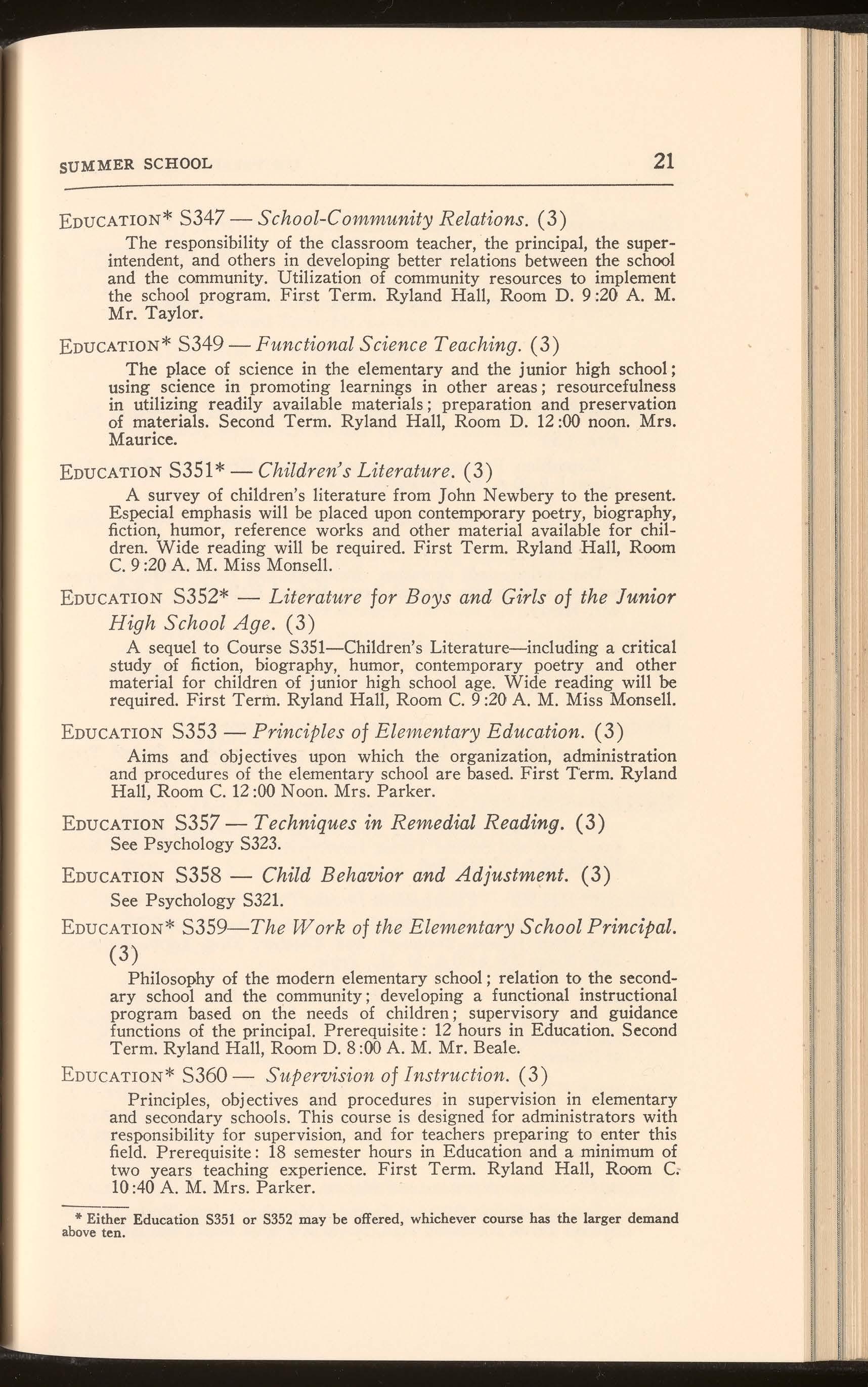 Designed to acquaint the teacher with various techniques for the correction of reading deficiencies. The emphasis is on practical classroom procedures. Methods for analysis of factors involved in reading deficiency are discussed. First Term. Maryland Hall, Room 108. 10:40 A. M. Mr. Grigg.