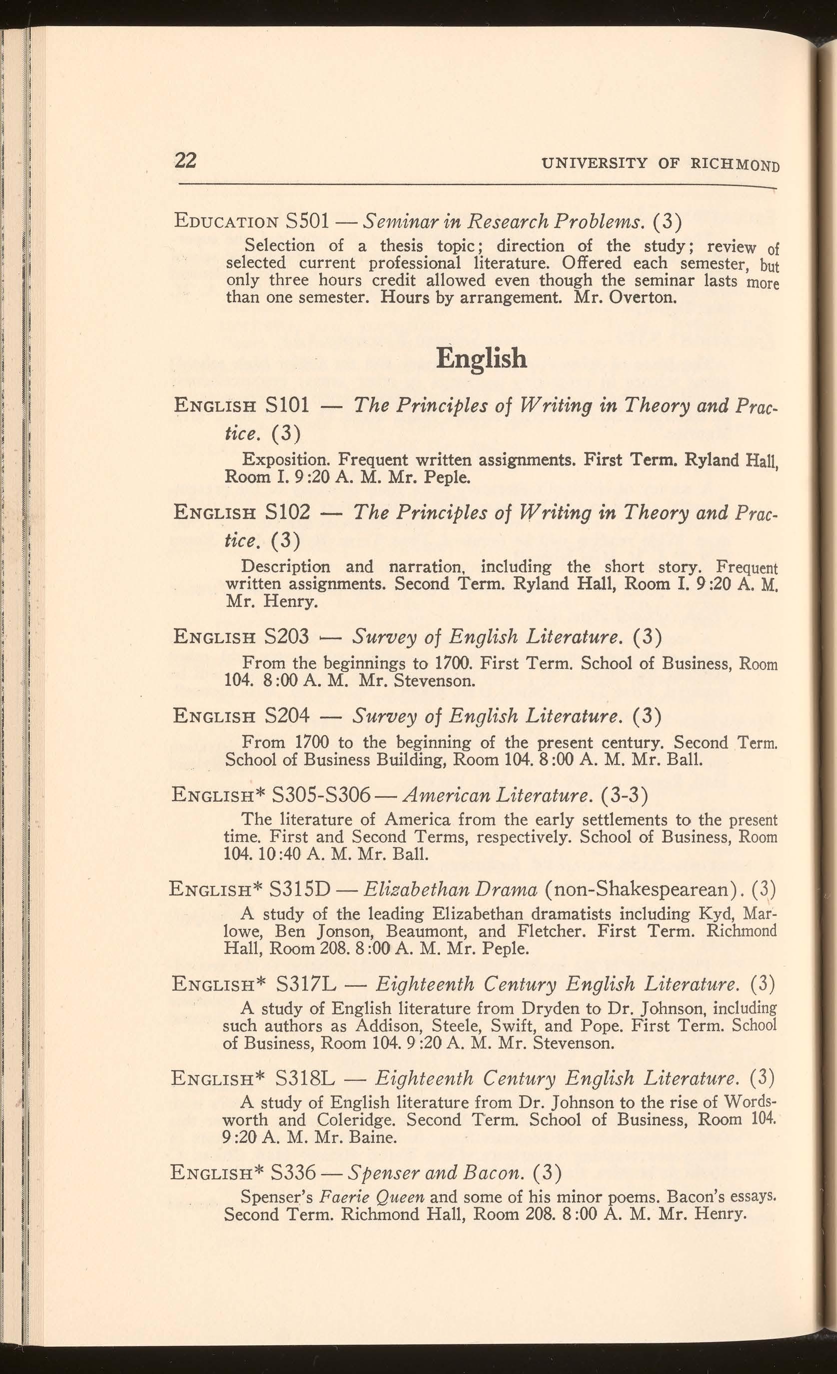 Theory of interest and discount, annuities, amortization, sinking funds, bond valuation, depreciation, and life insurance. Prerequisite: Mathematics 101 and 102. First Term. Richmond Hall, Room 204. 10 :40 A. M. Mr. Billman.