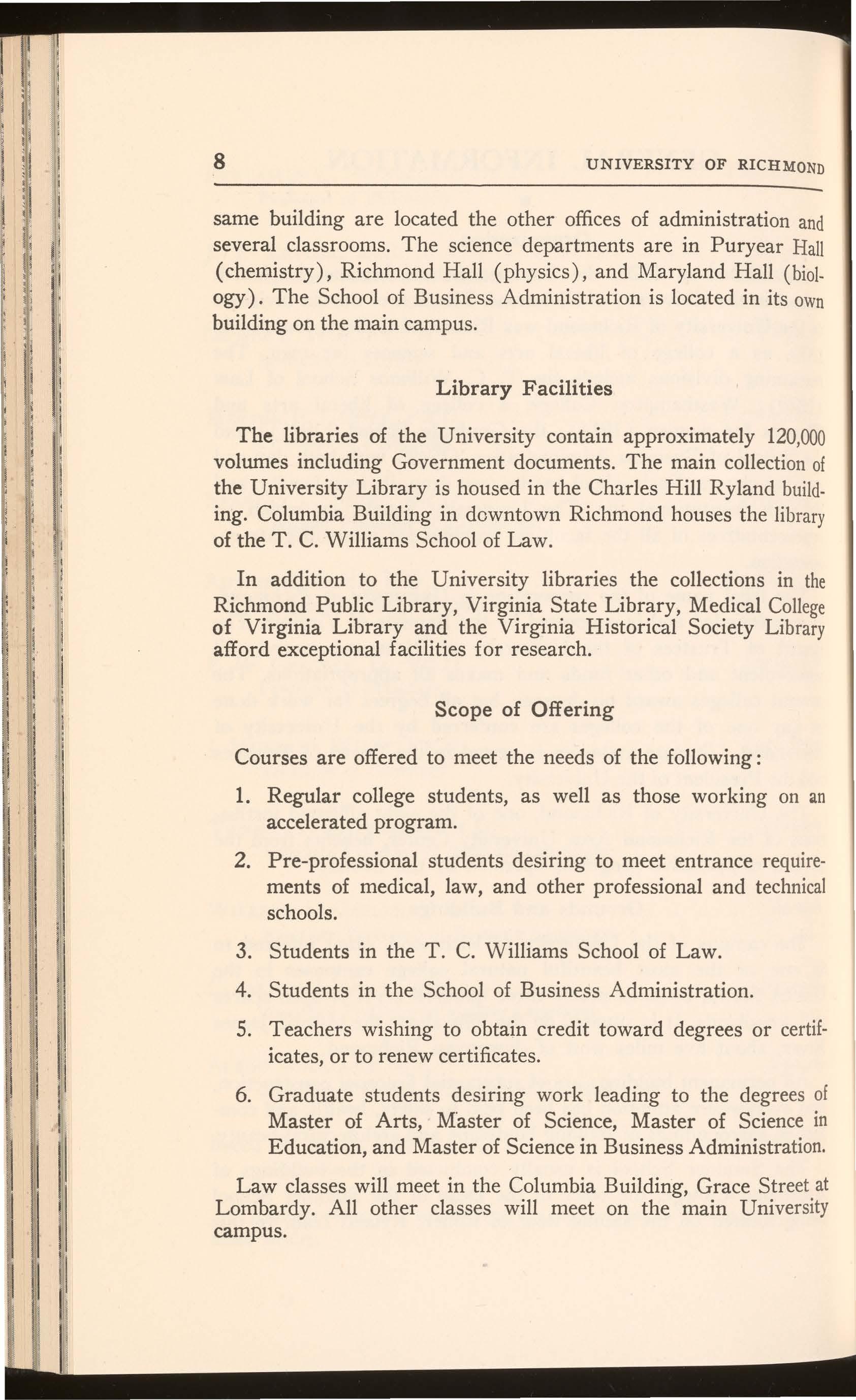 The libraries of the University contain approximately 120,000 volumes including Government documents. The main collection of the University Library is housed in the Charles Hill Ryland building. Columbia Building in downtown Richmond houses the library of the T. C. Williams School of Law.